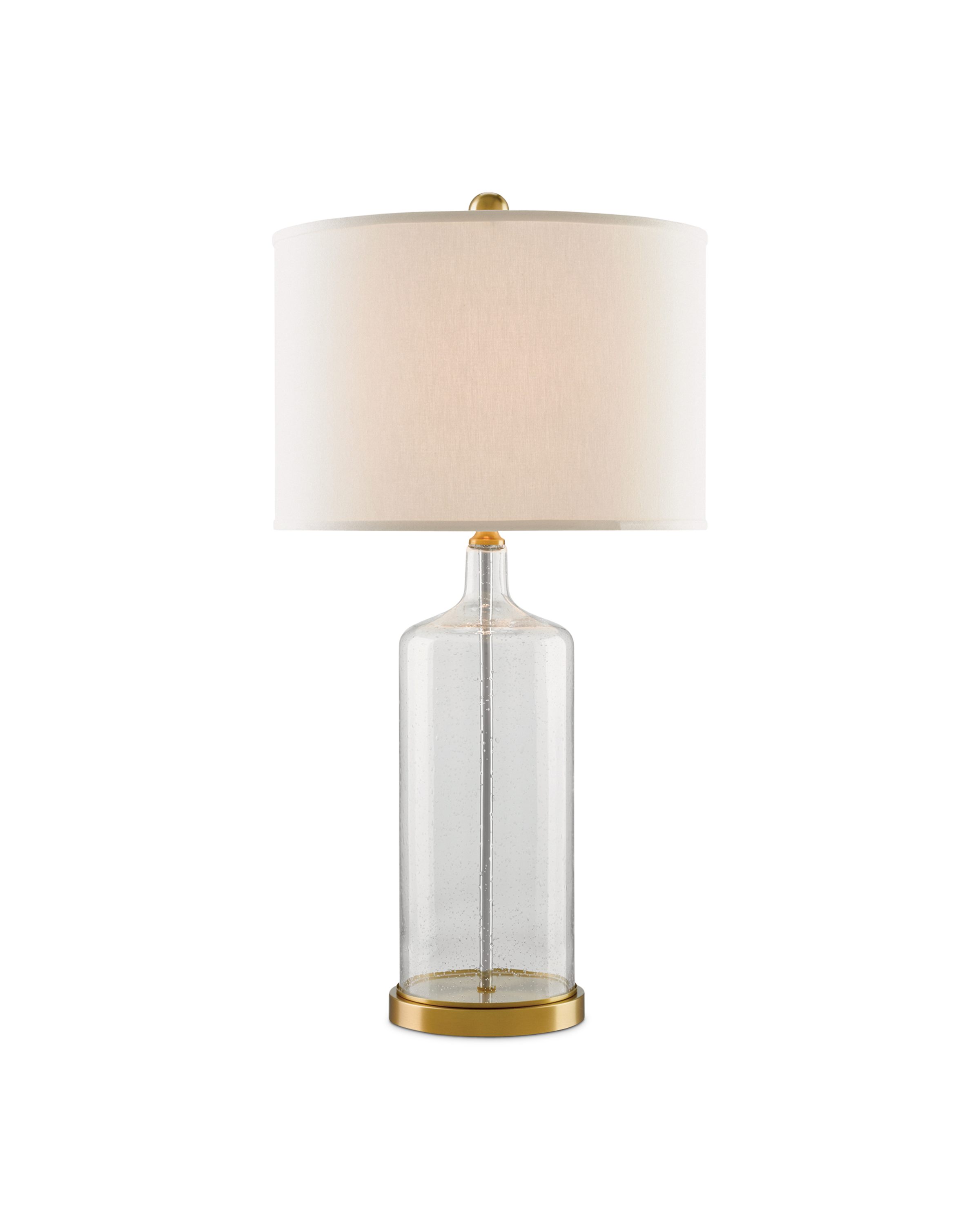 The Hazel Table Lamp with its bottle-shaped body in a marvelous clear seeded glass has a metal base, hardware, and finial in a gleaming brass finish. These add a touch of warmth to the design, as does the off-white shade on the clear glass lamp.