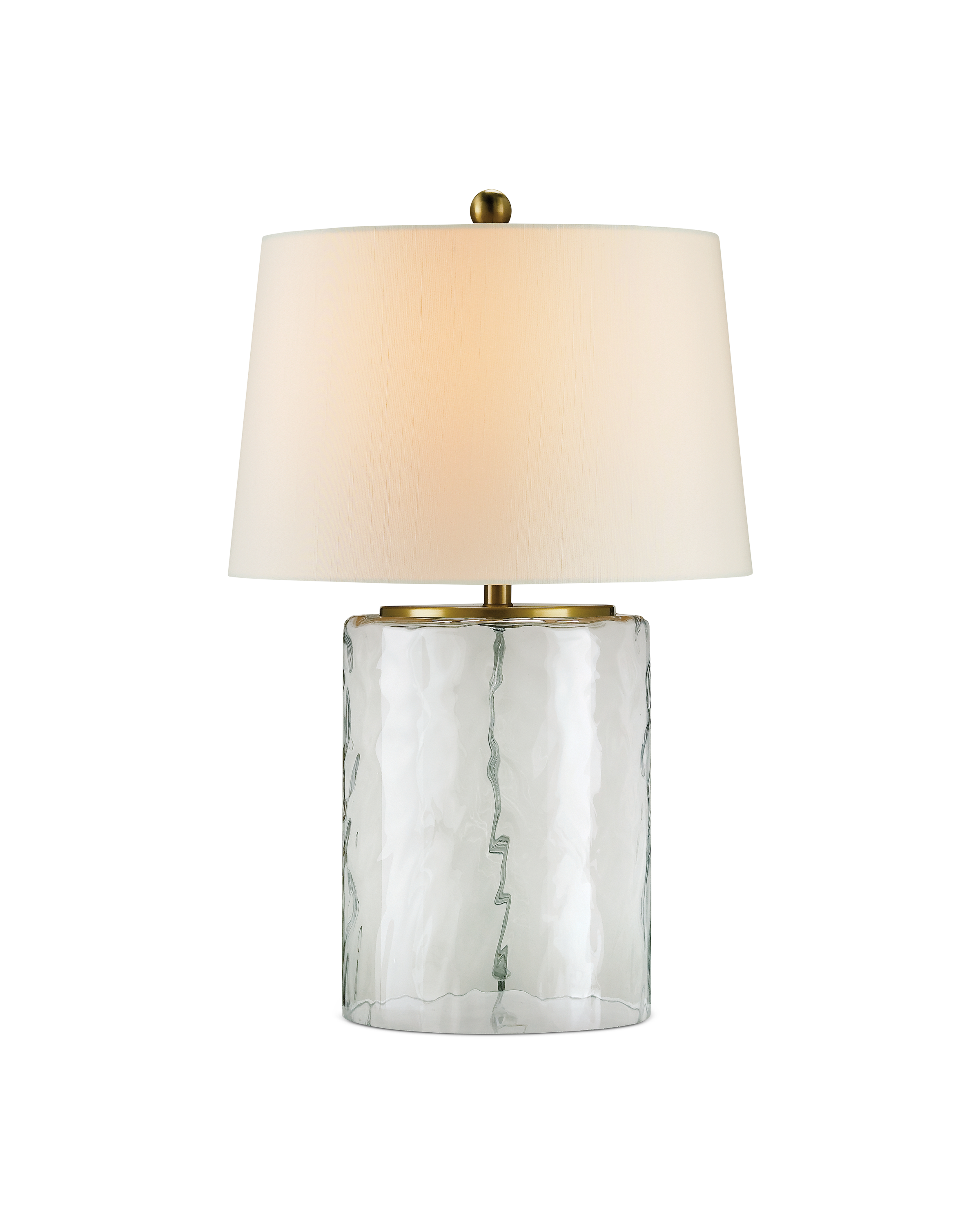 The elegant drum-like body of the Oscar Table Lamp is luminous in a watery glass that feels similar to the surface of an antique windowpane. The polished brass hardware and finial bring warmth to the clear glass lamp, which is topped with an off-white shantung shade.