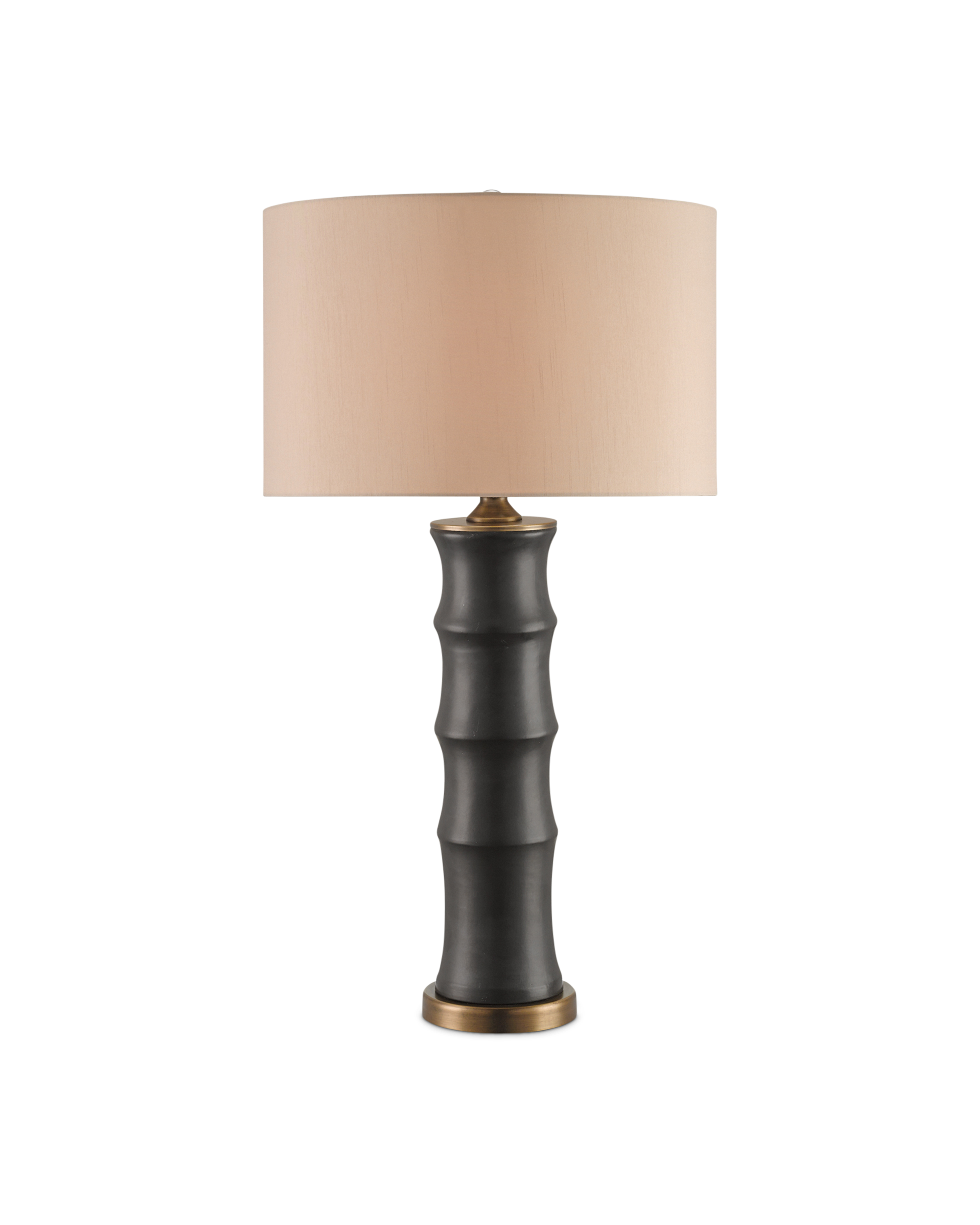 The Roark Table Lamp is made of ceramic to imitate the shape of a stalk of bamboo. The matte black finish on the column anchors the lamp, which glints when light strikes the antique brass hardware and base. The black lamp is topped with gold shantung shade that echoes the tones in the metal.