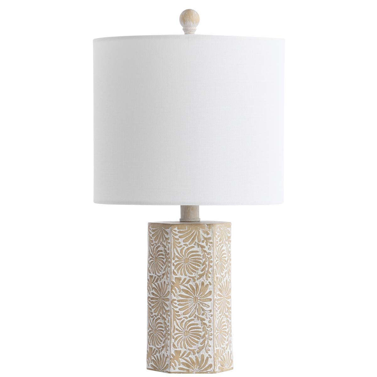Transform the living room into a soothing oasis with this serene beige table lamp. Designed with a delicate pattern that adorns its gentle angles, its off white cotton shade and matching beige finial are perfect for any style of decor.