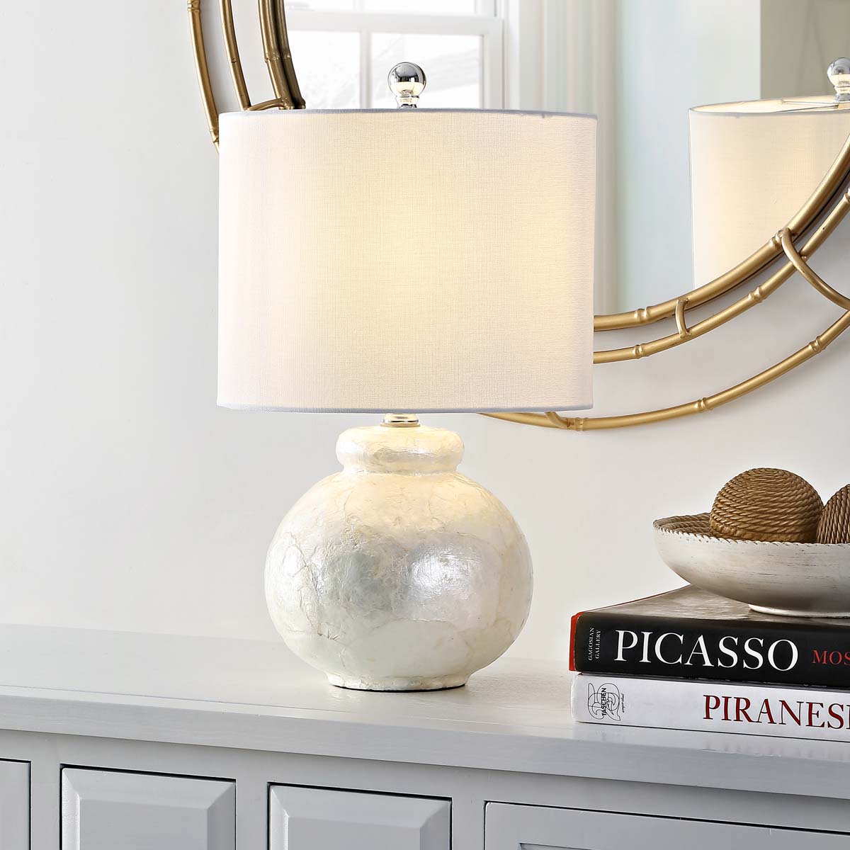 A must have for today?? contemporary d?cor, this Ivy Table Lamp is absolutely eye catching in its dramatic silhouette and pearlescent glow. An ivory seashell mosaic overflows with unmistakable glamour that beautifully enhances Ivy?? sophisticated shape.