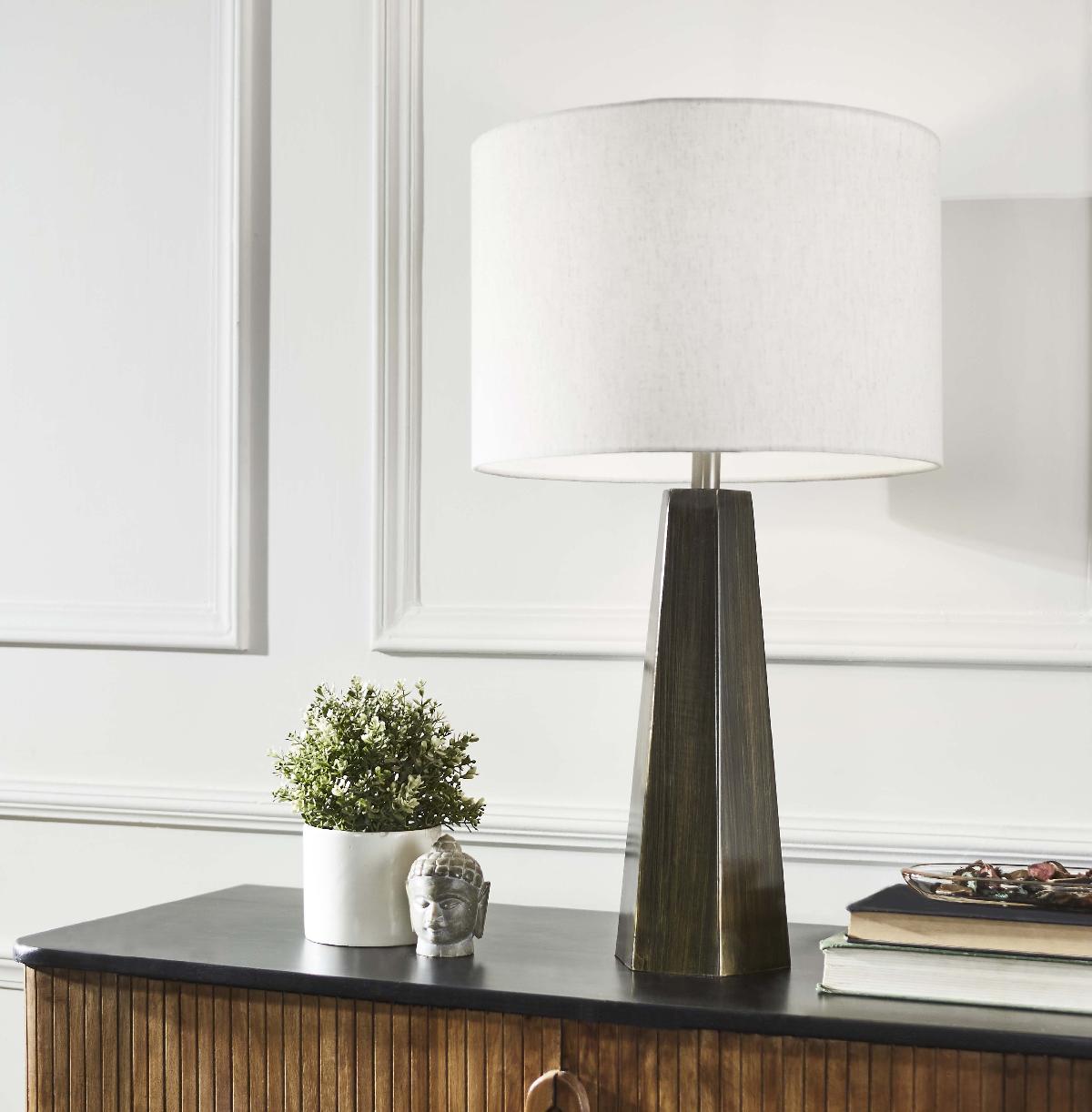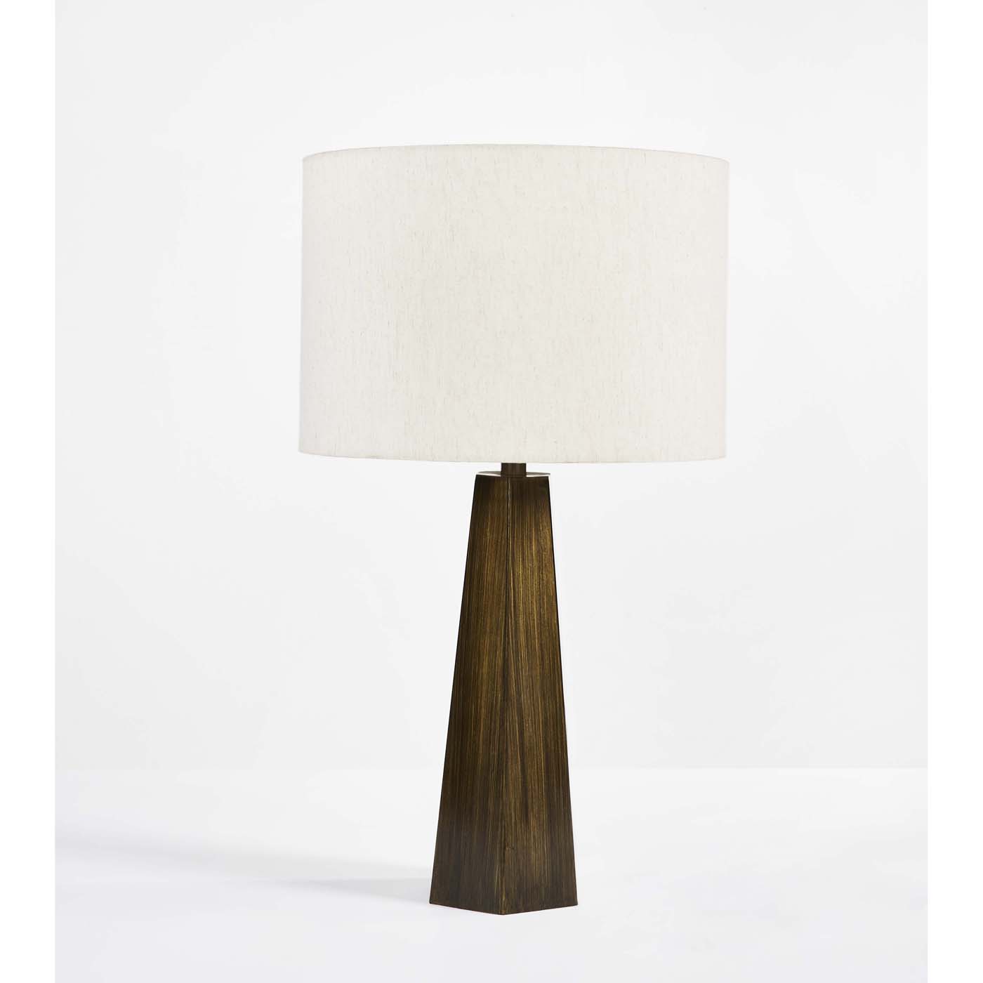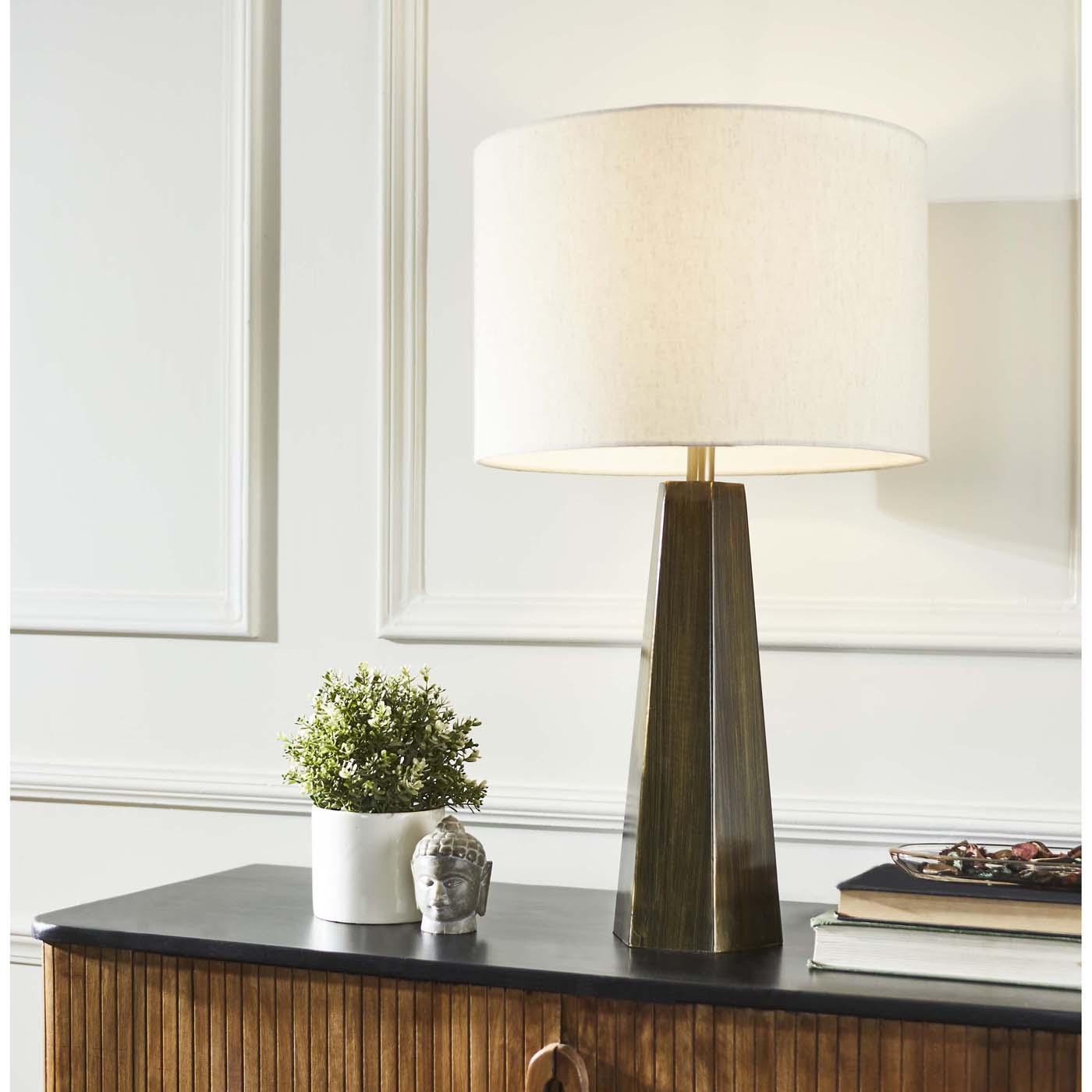 Statuesque and modern, this Jandean Table Lamp is a new style icon. Jandean?? antique brass finish perfectly complements its tapered geometric column base, and a cream cotton shade completes the look.