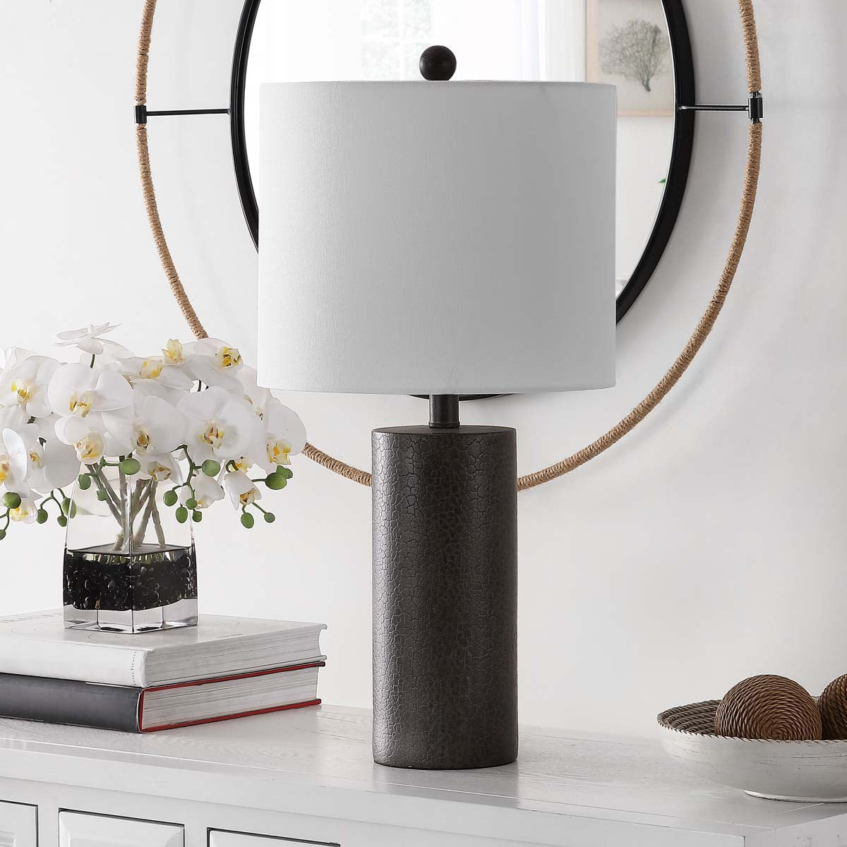 Ideal for bringing subtle unique intrigue to clean lined or minimalist spaces, this Nori Table Lamp is more than meets the eye. Nori?? visually textured drum shade and dark grey cylindrical body will make you look twice as it casts a soft glow in any room.
