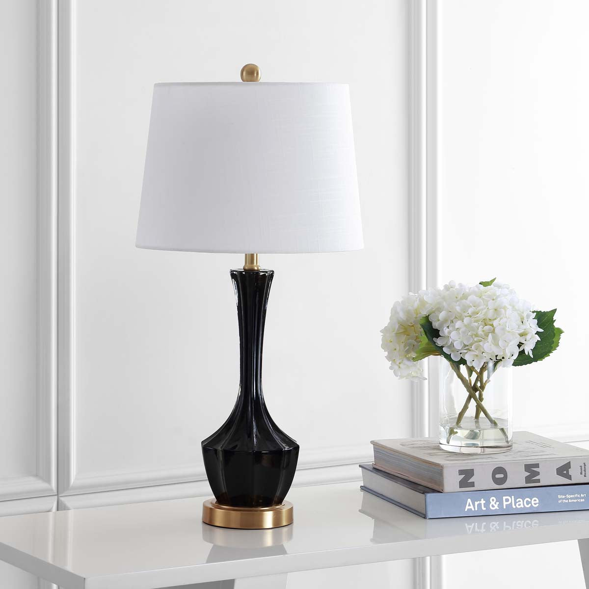 In the mood for mod? This chic contemporary table lamp brings style to any living room with its sleek black retro genie style body. It luxurious gold finished base and finial brings just the right amount of shimmer. Its cotton shade is complementary.