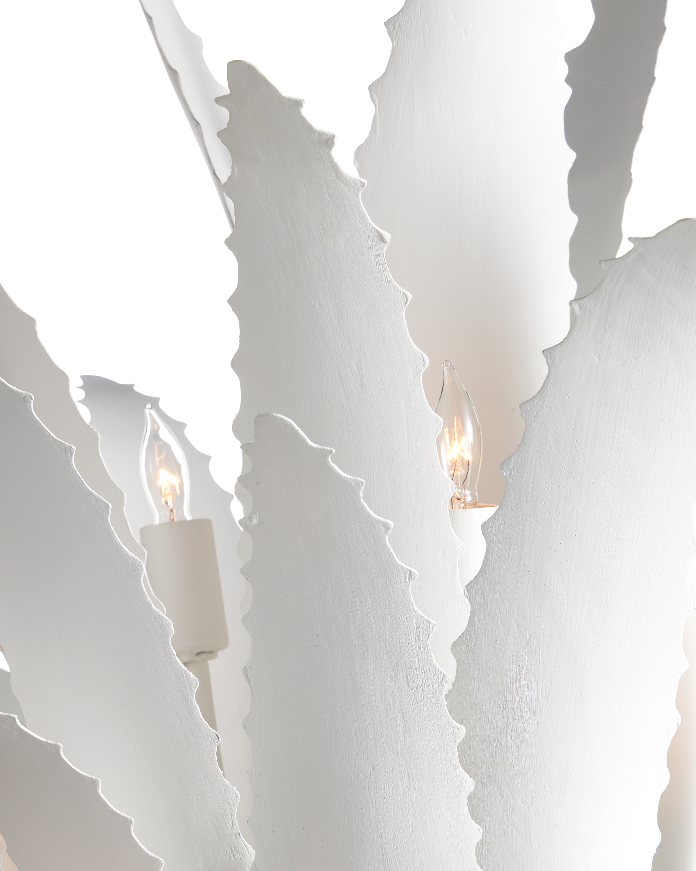 The Agave White Chandelier was inspired by the flourishing plant of the same name, whose spiky, leathery fronds curl up from the ground. This sense of movement has been captured in the flowing spikes on this white chandelier. “My love of the Agave plant, of which hundreds of varieties flourish in the peninsula, has inspired me for many years,” says the fixture’s designer Marjorie Skouras. Her passion for the Yucatan shines through in this wrought iron creation covered in a crisp gesso white finish. Adjustable from 31" to 73" with use of included chain/rod kit/cable. If your space calls for a longer drop, additional chain/rods/cable is available for purchase.
