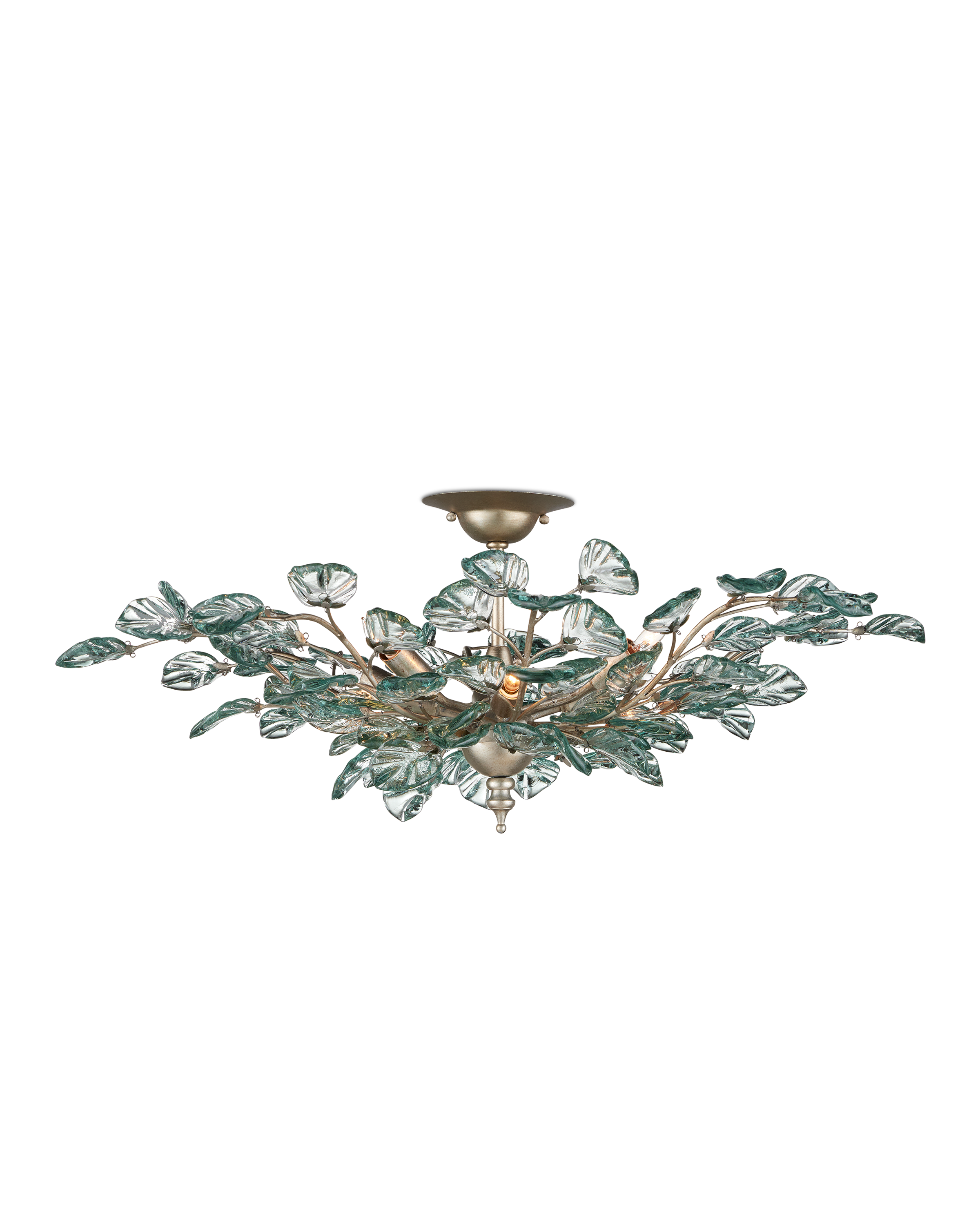 The Baobab Semi-Flush Mount has luminous leaves that are made of recycled glass and pressed into shape. The biophilic design is made even more graceful by the placement of the glass pieces that seem to be fluttering in a breeze. These are attached to wrought iron stems in a contemporary silver leaf finish that gleams beautifully.