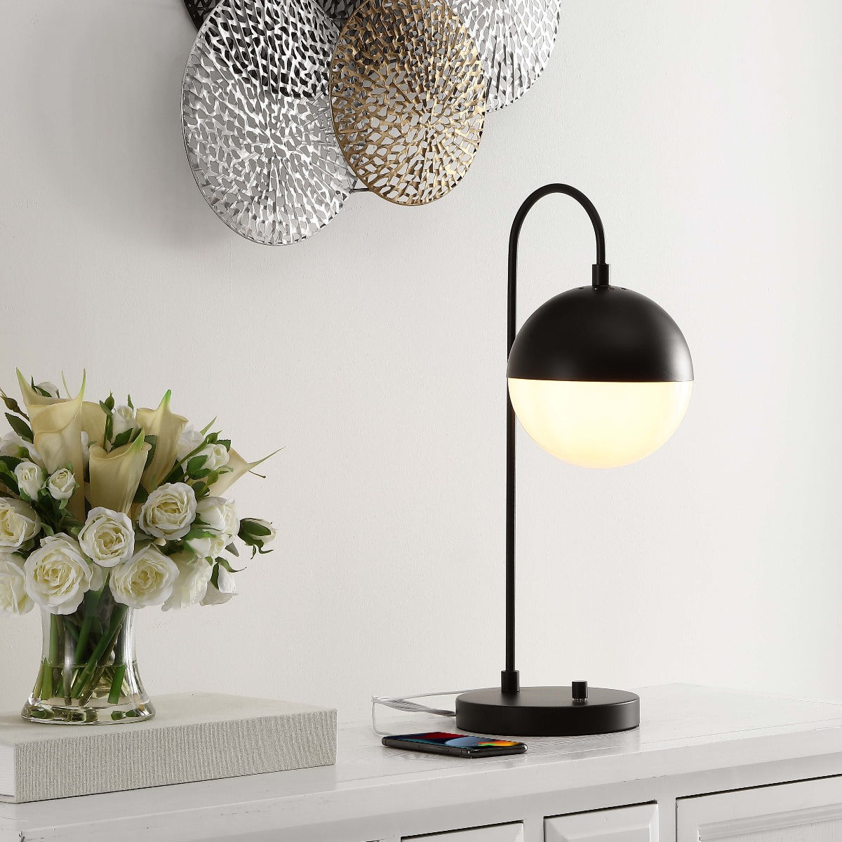 Inspired by edgy mid century modern style, this contemporary table lamp steals the show in any living room. Designed with a luxurious modern finish, it diffuses light from a partially white retro globe shade to create a warm glow.