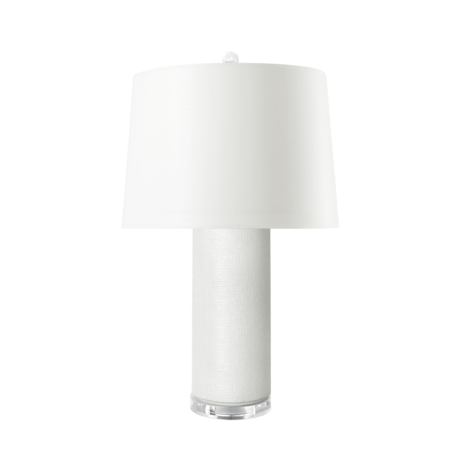 The Cleo Lamp lights up a room with the simple sophistication of Americana design. We could see it fitting in to the tastefully luxurious schemes of a coastal home in the Northeast, standing like a lighthouse amidst cool tones and organic materials, with the sound of waves coming in through a window. Its ceramic column form has been lacquered and given a uniquely textured, woven finish, with a clear acrylic base acting as a glistening complement to its chic white body. Please note that the shade is sold separately.7w x 7d x 29h