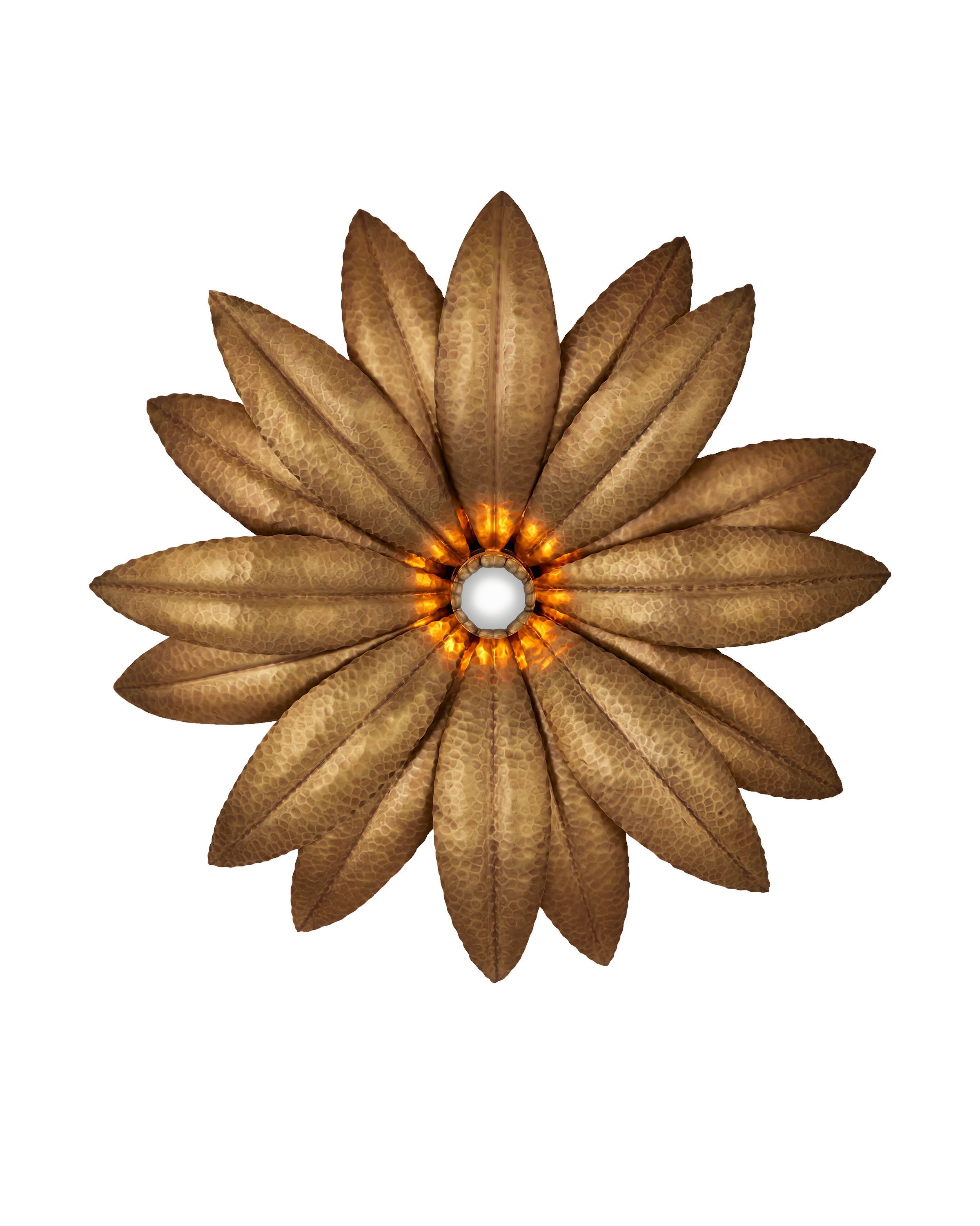 The Alithea Single Wall Sconce is made of brass in an antique brass finish. The petals on this nature-inspired gold sconce have been hand-hammered to give them life-like personality. Designed by Tom Caldwell, the floral sconce will be a pretty addition to any space it illuminates. The button-like bulb brings the metal a luminous sheen.
