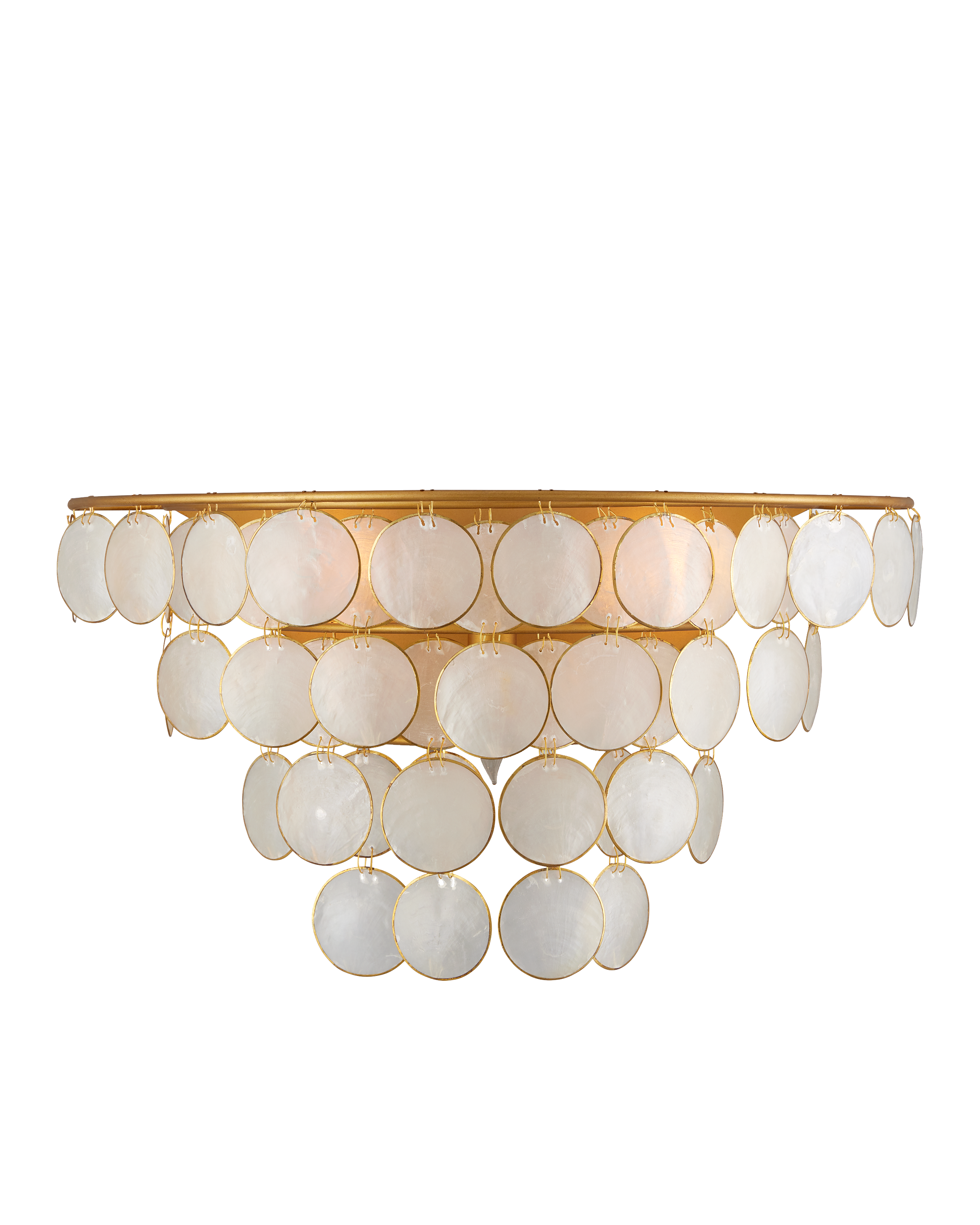 Ethereal in its vibe, the Bon Vivant Sconce was designed by Tom Caldwell. The discs that effervesce with illumination are made of Capiz shells ringed in a decorative metal edge that matches the gold finish on the rest of the fixture. The delicate scale of the wires that fasten the discs to the frame and to each other is a sophisticated design detail. This gold and white wall sconce is a mid-century-modern inspired design.