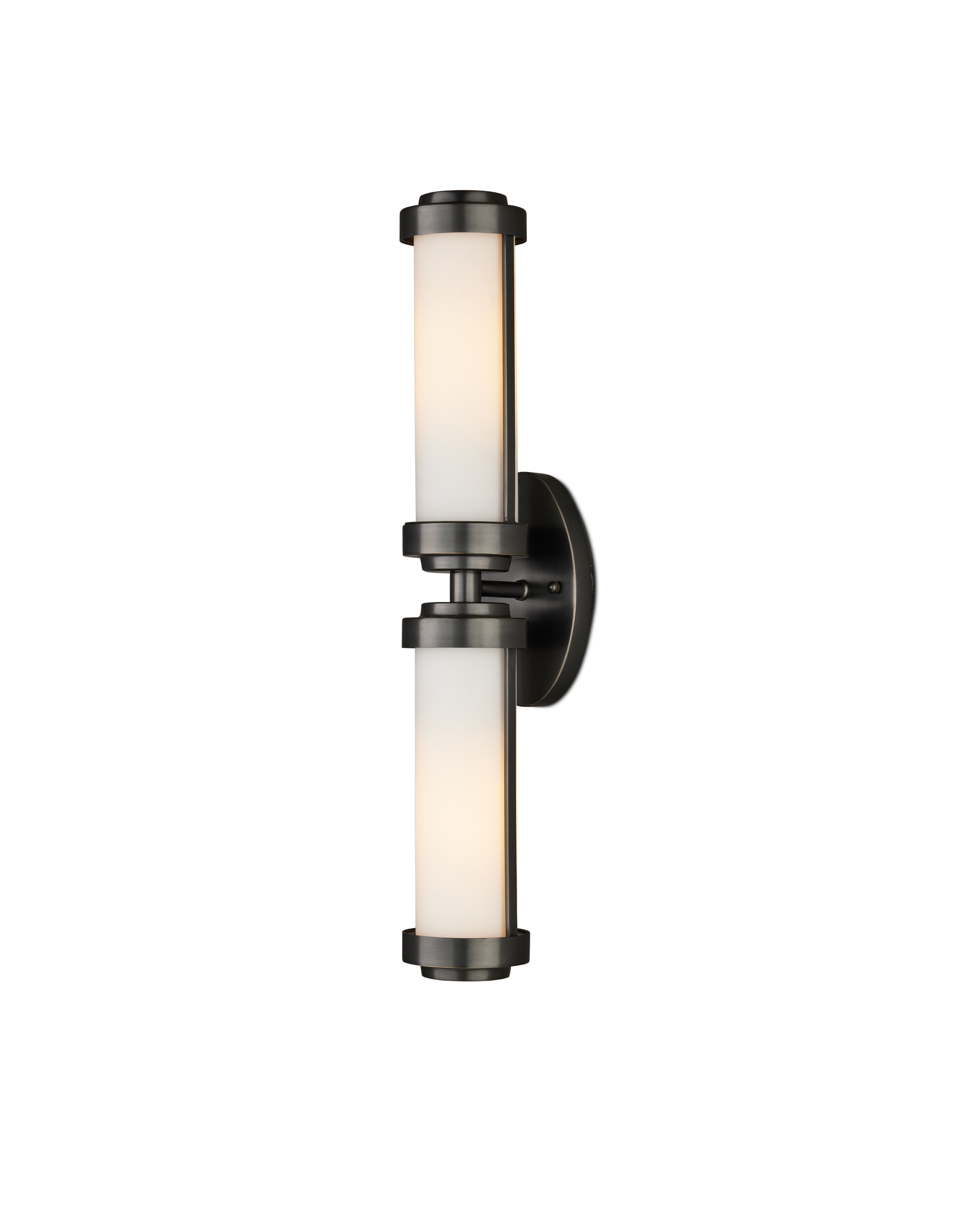 The Bowland Bronze Bath Wall Sconce features a contemporized hourglass shape designed with a fresh, modern feel. Inspired by an antique fixture, the time-honored profile is updated with sleek caps surrounding the opaque glass tubes at the top and bottom. The articulate center transition between the two elements further enhances this modernization. The metal on this sconce is in an oil-rubbed bronze finish.