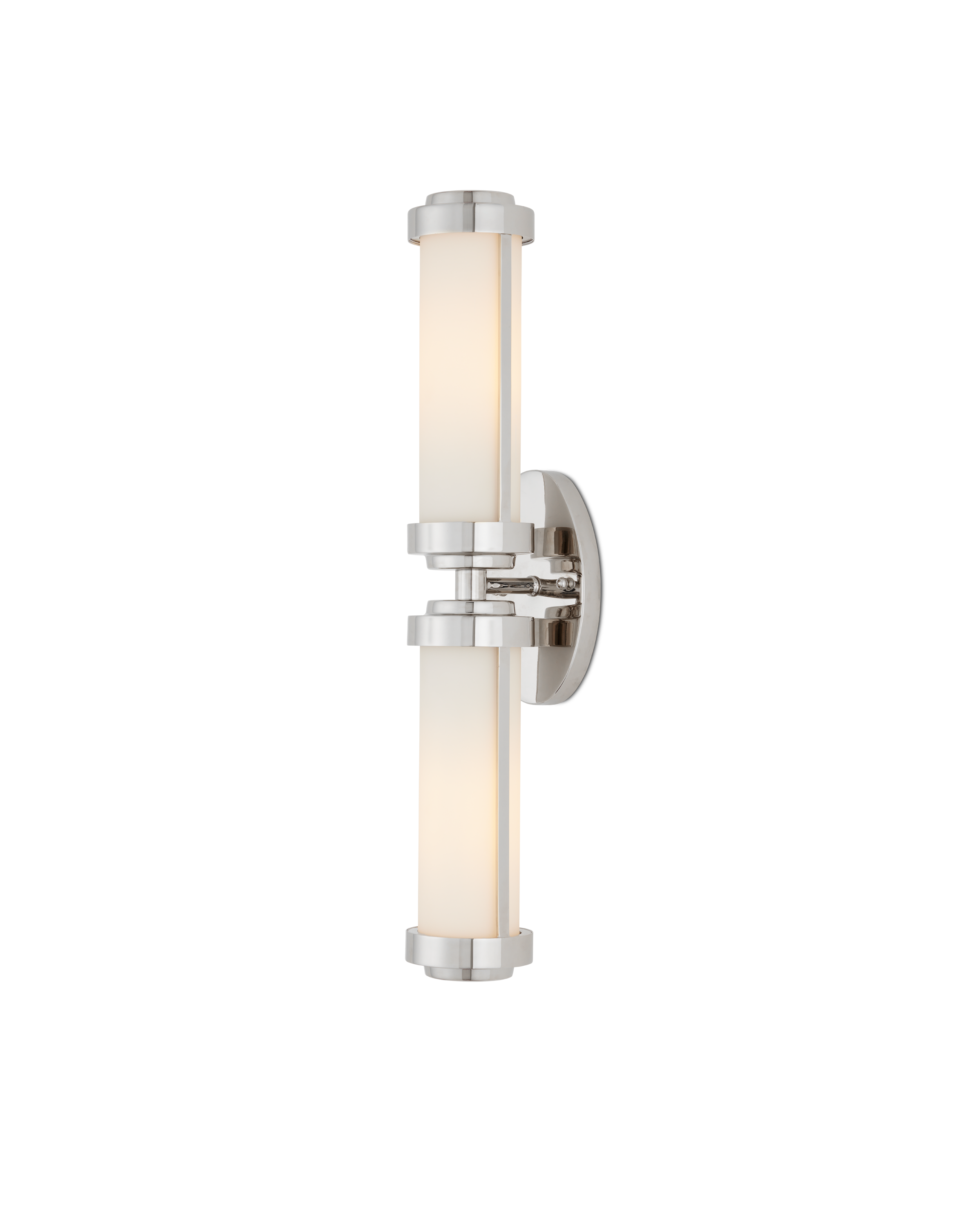 The Bowland Nickel Bath Wall Sconce features a contemporized hourglass shape designed with a fresh, modern feel. Inspired by an antique fixture, the time-honored profile is updated with sleek caps surrounding the opaque glass tubes at the top and bottom. The articulate center transition between the two elements further enhances this modernization. The metal on this fixture is in a polished nickel finish.