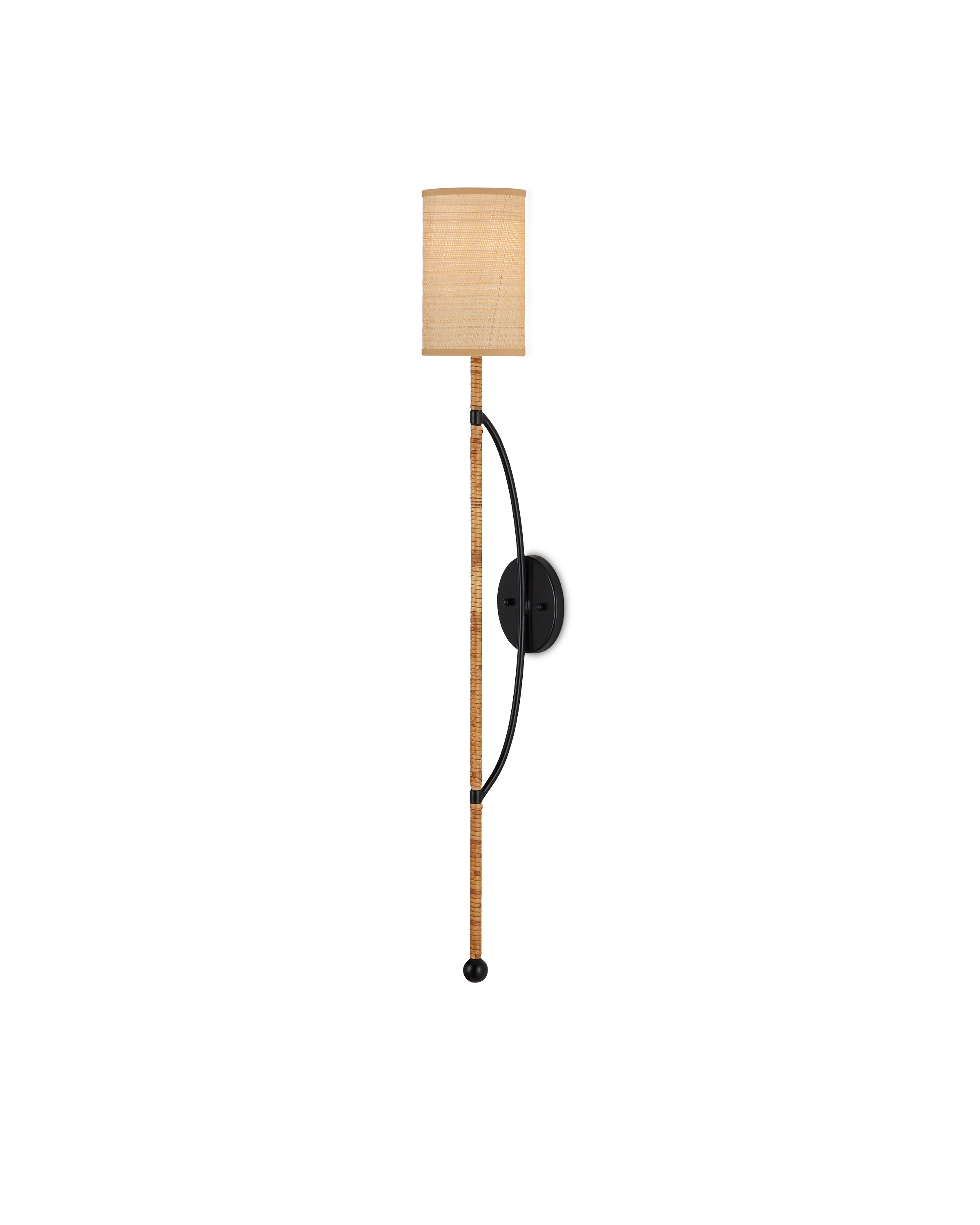 A seriously clever design, the Capriole Rattan Wall Sconce looks as if it is made of a floating stem of natural material when viewed from the front, but when seen from the side, the bow-shaped hardware that attaches it to the backplate creates a dynamic design detail. The way the minimal metal bands clasp the stem creates further interest. To contrast the natural rattan, Clarence Mallari, the designer of the fixture, chose a satin black finish for the metal.