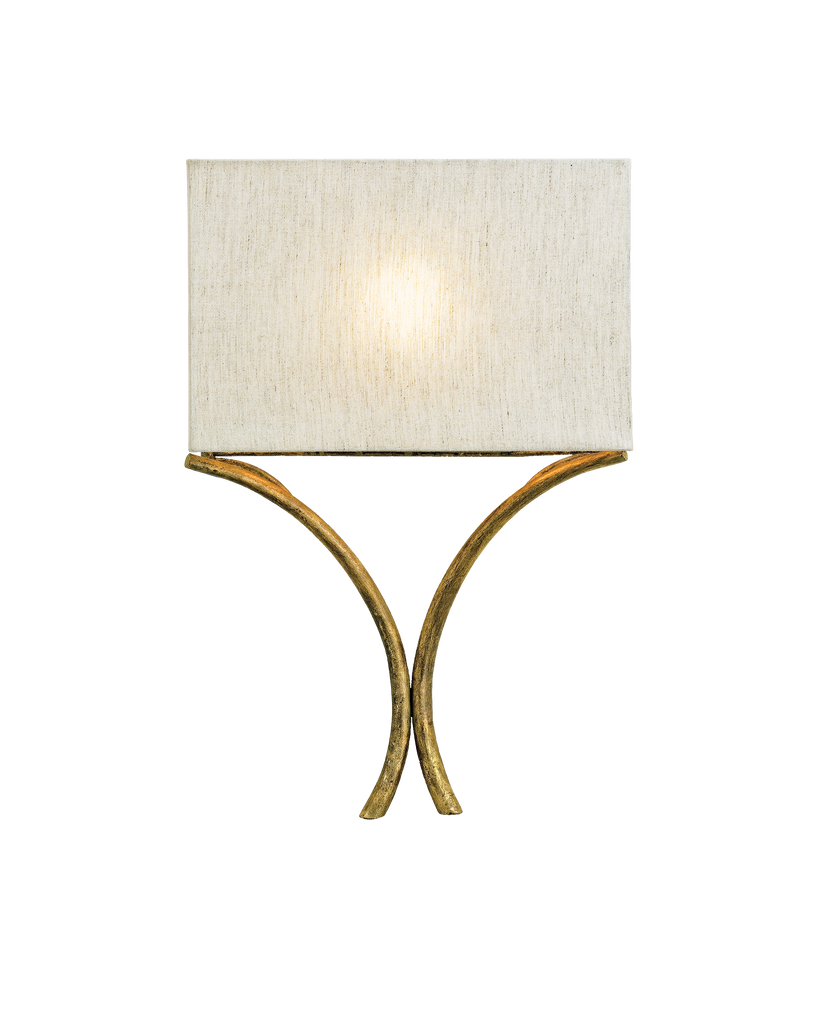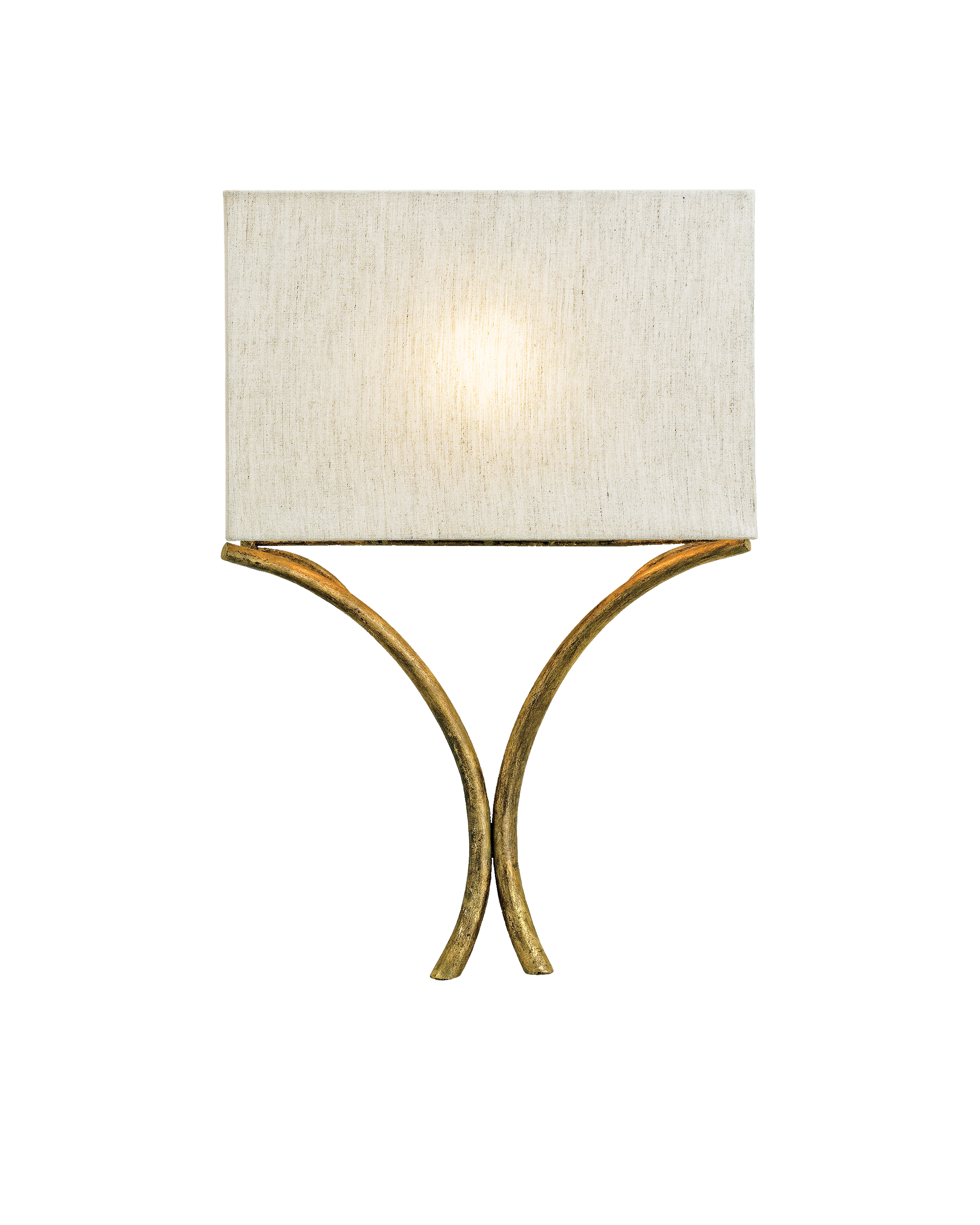 The wrought iron stems holding the natural linen shade of the Cornwall Gold Wall Sconce are fashioned in a wishbone shape. The rectangular shape of the shade and the French gold leaf finish on the arching lines that balance it make this sconce a stylish one. The Cornwall meets ADA requirements.