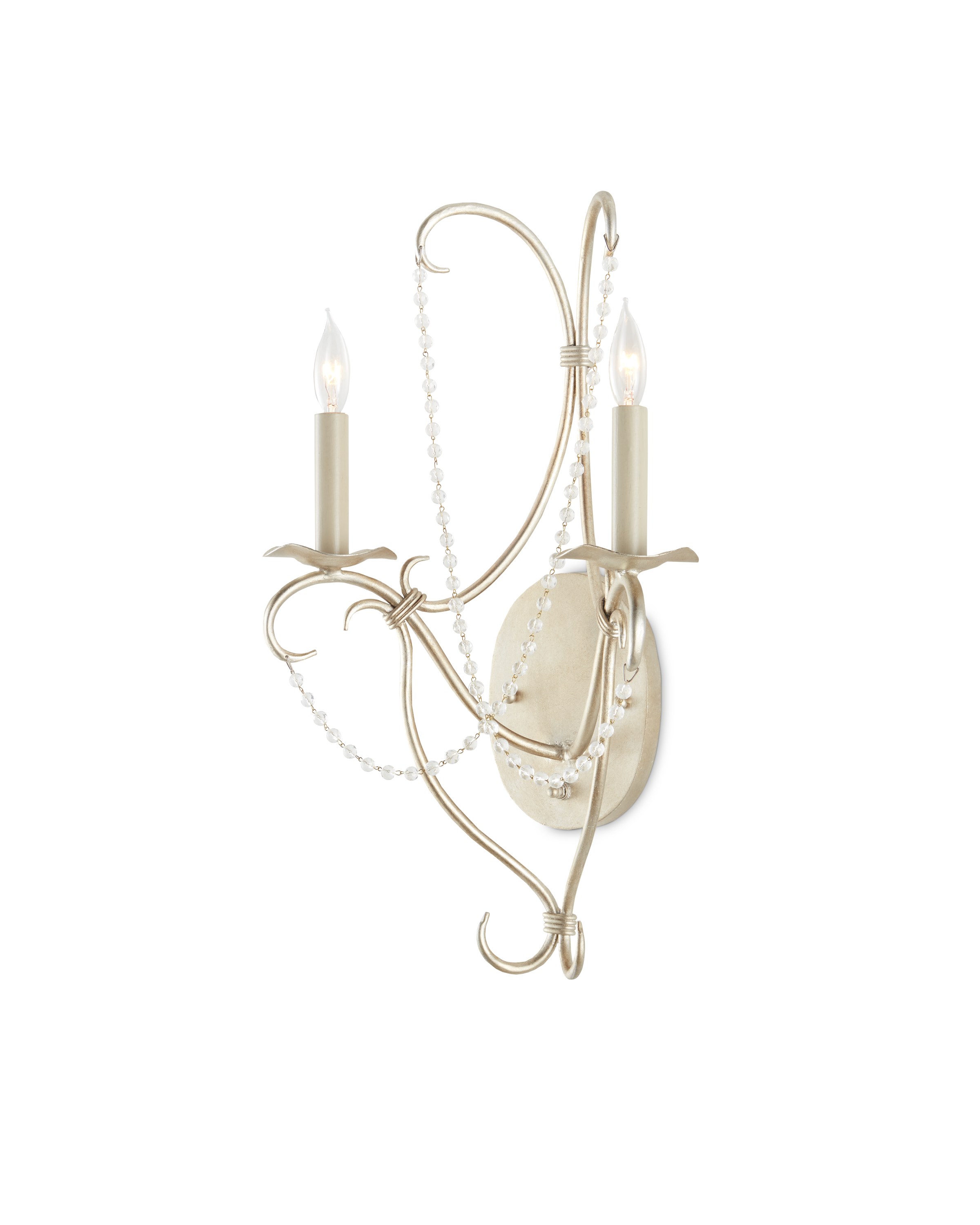 The Crystal Lights Silver Wall Sconce has two strands of crystal beads that swag between wrought iron curls in a silver leaf finish. The distressed sconce balances two candelabra bulbs. The Crystal Lights family includes silver and gold sconces, and chandeliers in silver leaf and gold finishes.