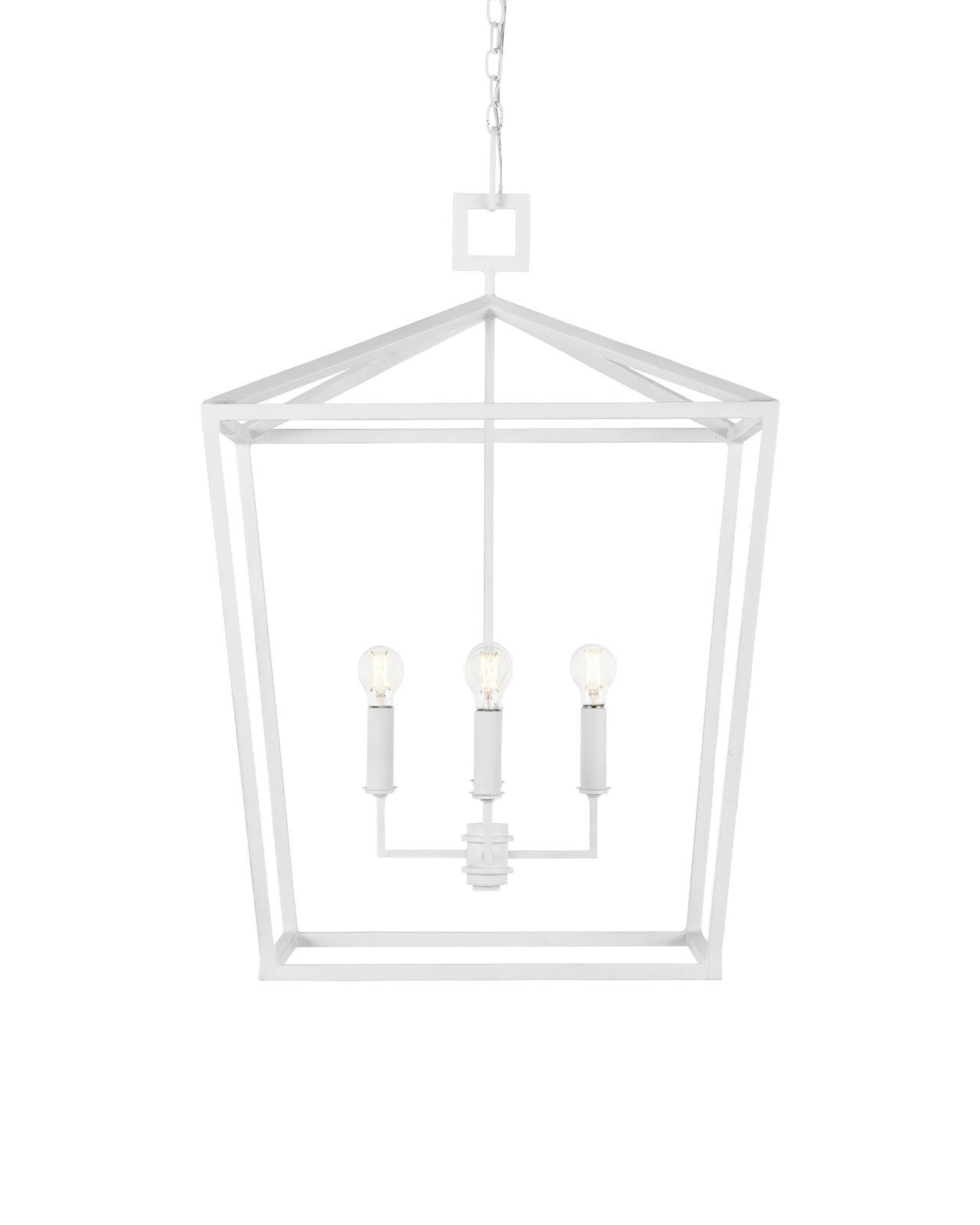 The Denison White Grande Chandelier is a hammered wrought-iron fixture in a gesso white finish. This classic lantern shape has stood the test of time to make it one of our most popular offerings. A refined aspect of the design is the square that fastens the lantern to the chain. The pared-down profile and pale finish on this version makes it perfect for coastal aesthetics. Adjustable from 57" to 148" with use of included chain/rod kit/cable. If your space calls for a longer drop, additional chain/rods/cable is available for purchase.