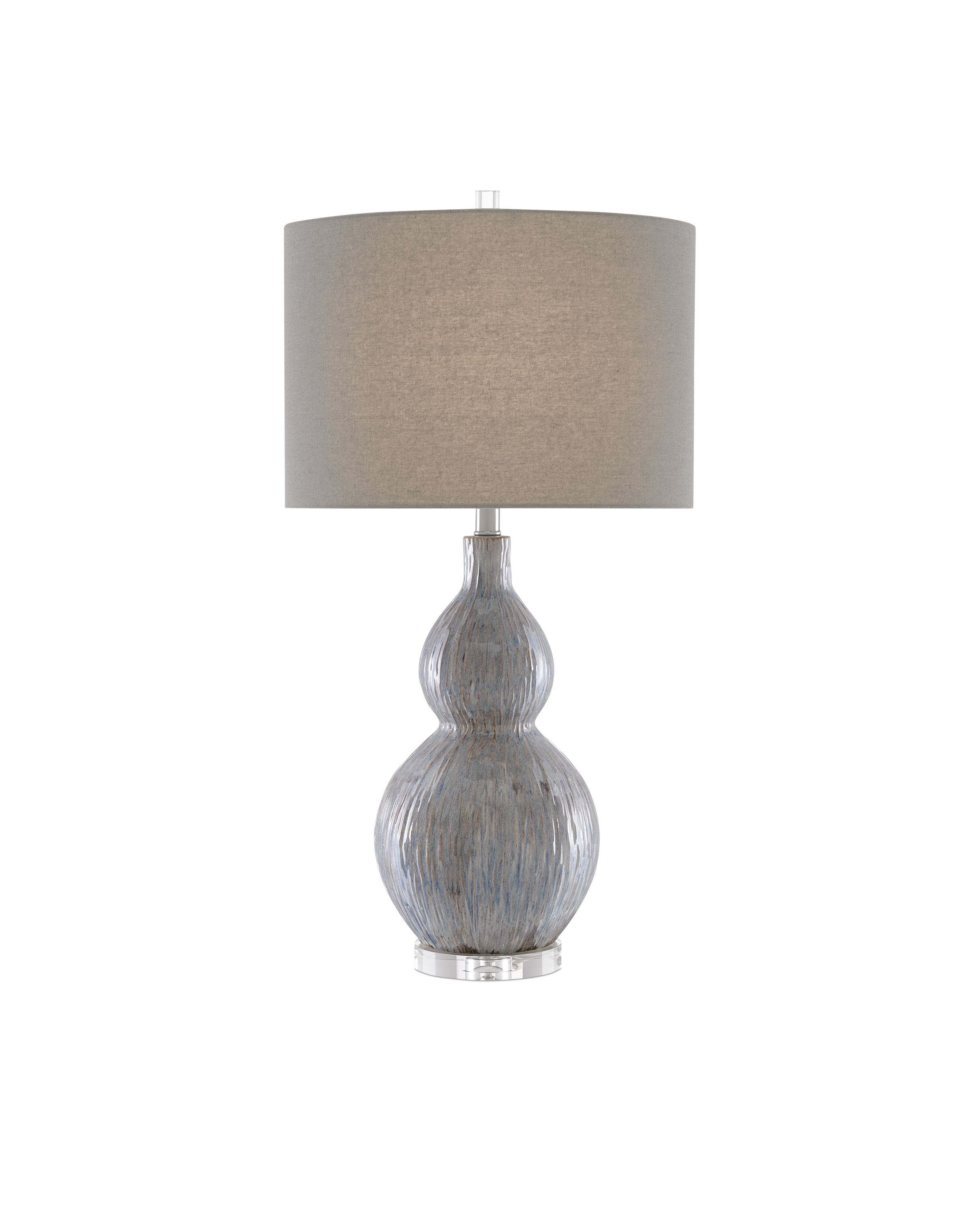 The gourd shape of our Idyll Table Lamp has been realized in porcelain. The striated surface in gray, blue, and taupe tones is texturally rich. The gray lamp sits atop a clear optic crystal base and is fitted with a gray shade.