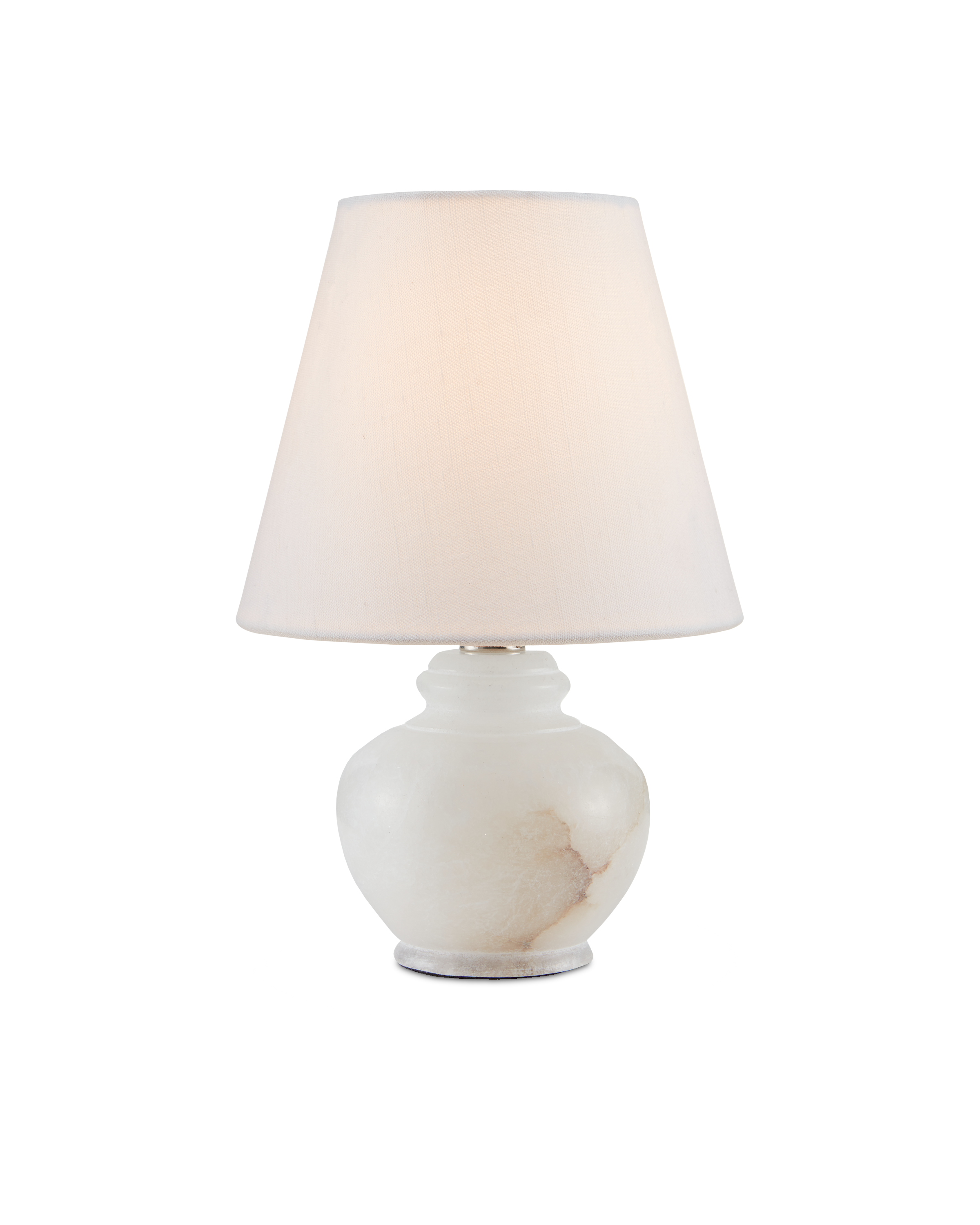 The Piccolo Mini Table Lamp is a very petite alabaster lamp that was modeled after a vintage design owned by a member of the Currey & Company product development team. At 4.5 inches high to the shade, the little lamp is perfect for sliding into a bookcase. But it is so beautifully luminous when lit, it will hold its own in decorative arrangements.