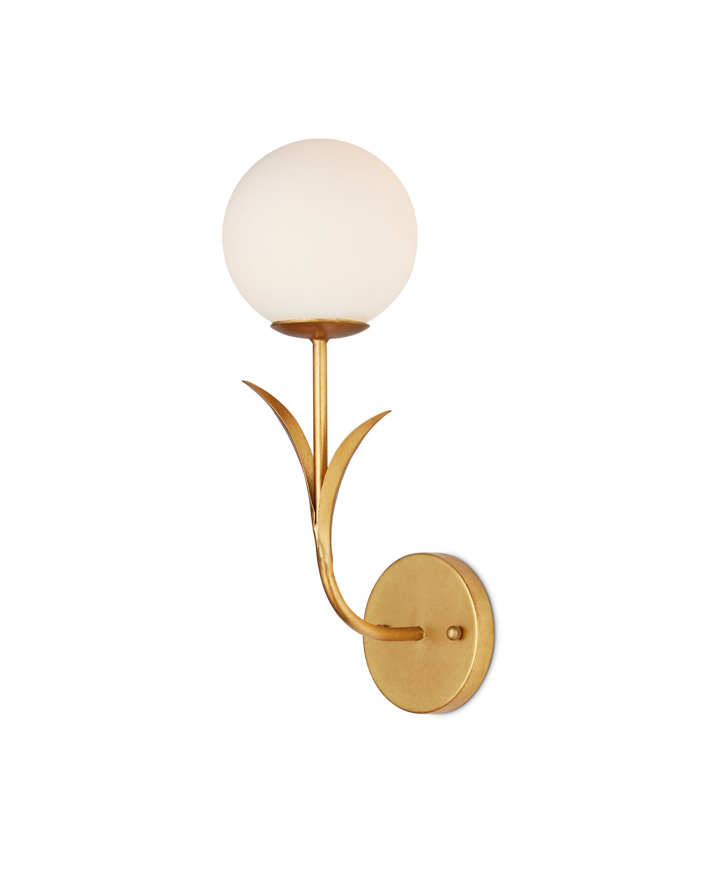 The Rossville Wall Sconce exudes a contemporary retro vibe with its globe-shaped bulb. This nature-inspired gold sconce is modern in its makeup with the thin arcing leaves that flow from it. Made of wrought iron in a contemporary gold leaf finish, the bobeche balances its white glass globe brilliantly.