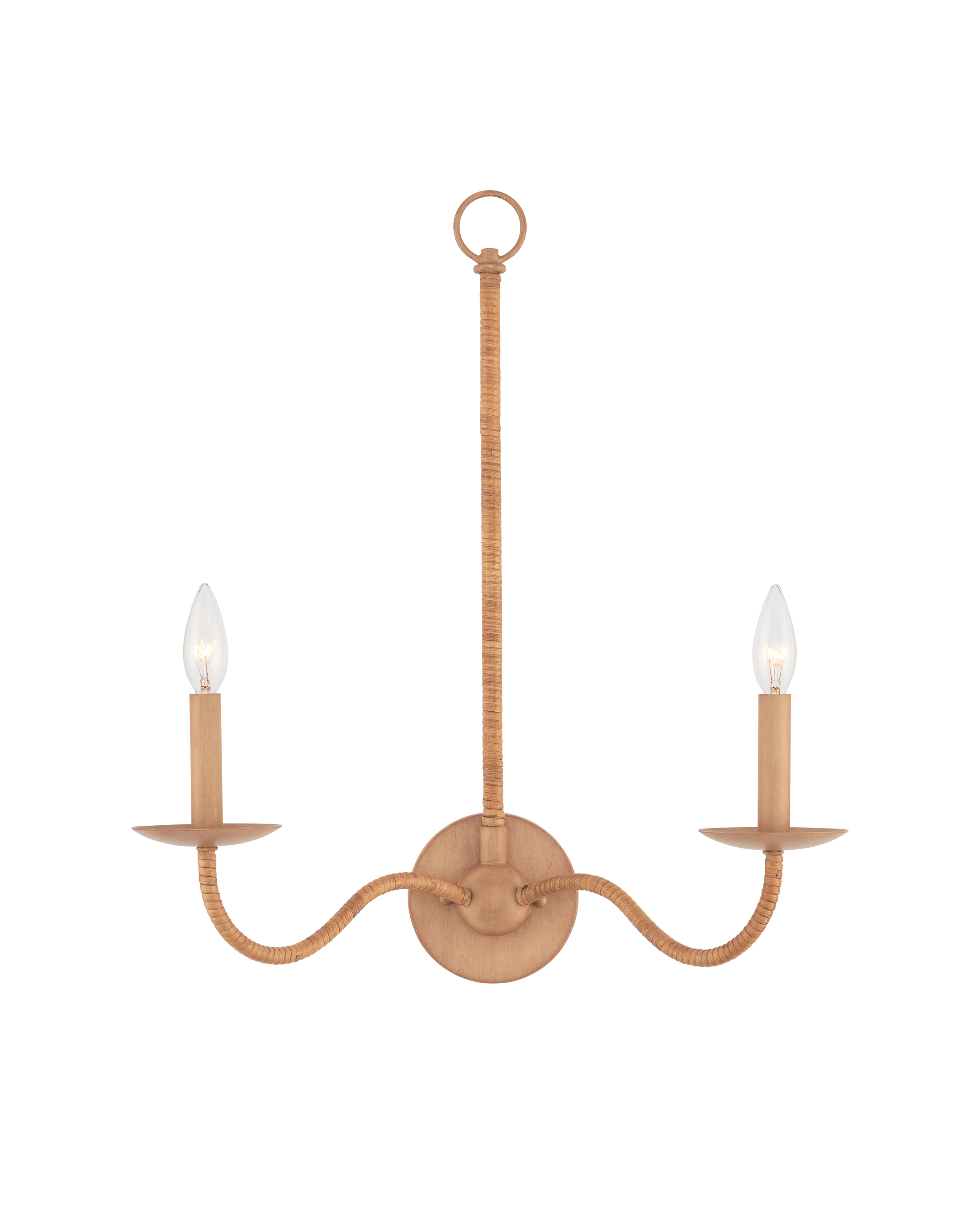 The Saxon Double-Light Tan Wall Sconce harkens back to the early days of design in American with its nostalgic references. The rattan wrapped around it brings it a stylistic twist, as the natural material broadens its appeal to a coastal aesthetic. This is an artisanal piece, as the rattan is painstakingly wrapped by hand and the saddle tan finish on the wrought iron is pitch-perfect in tone.