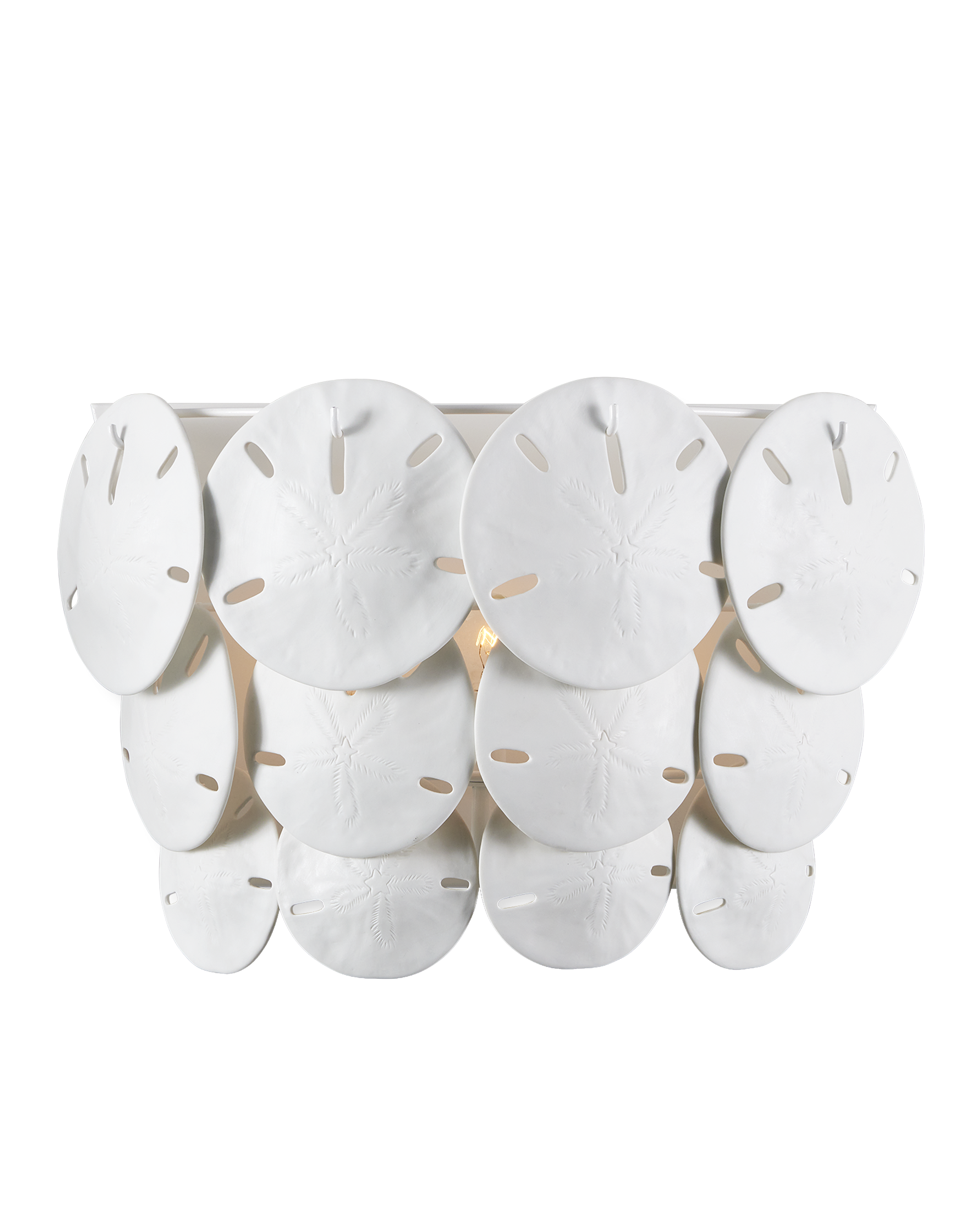 Marjorie Skouras designed the Tulum White Wall Sconce, inspired by the tropical beauty of the Yucatan Peninsula where she lives. This is a beautifully delicate design, as the sand dollars are cast in semi-translucent bone china and they make a pretty sound when a strong breeze ruffles them. There are three sizes of removable sand dollars on this design, which makes it easy to clean them. The sugar white finish on the hardware complements the pale discs on this nature-inspired wall sconce, making it apropos for rooms overlooking the ocean.