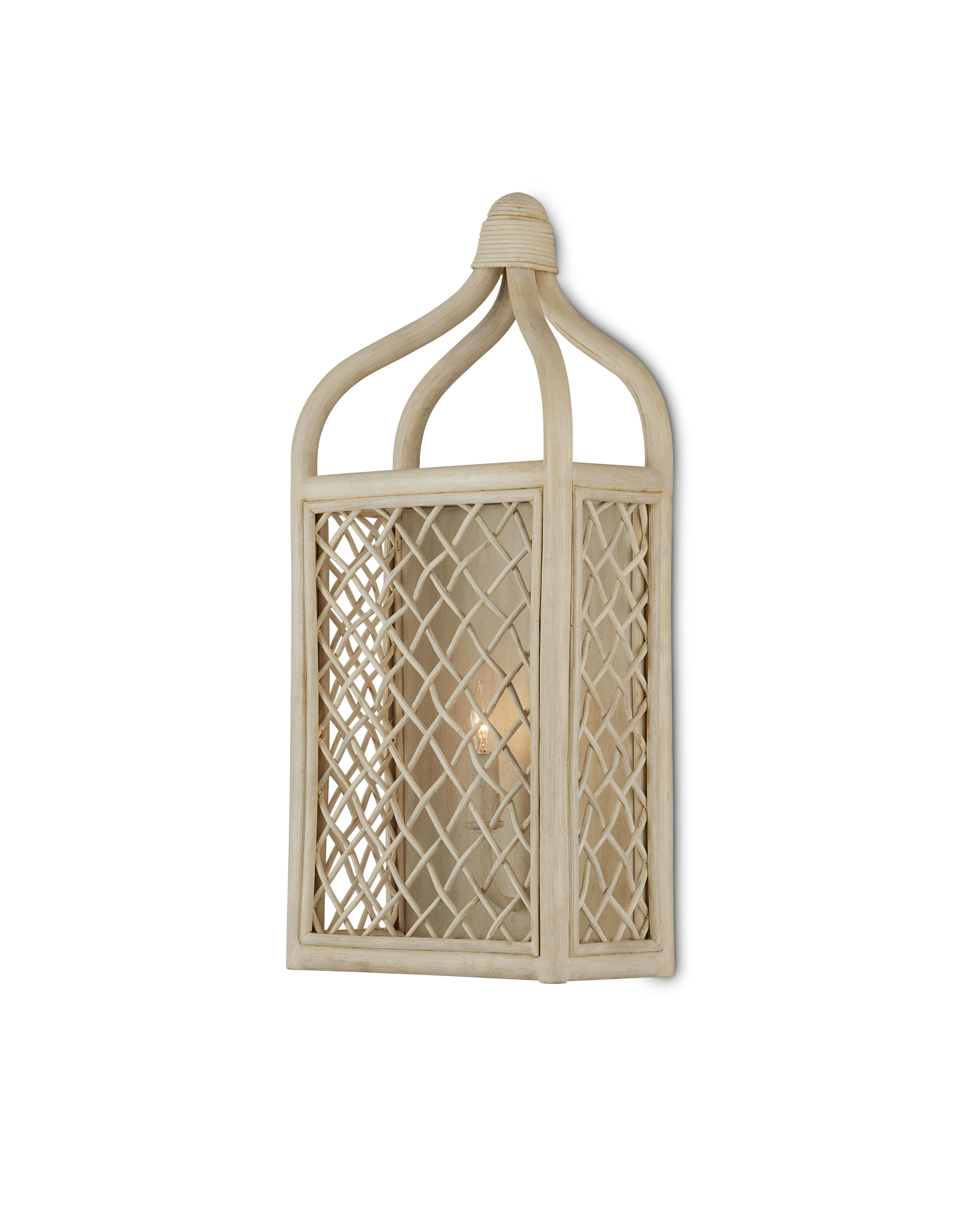 Achieving a traditional lantern shape entirely from rattan is a feat, one that was beautifully realized when artisans wove the Wanstead Ivory Wall Sconce from the natural material, slicing the normal depth in half while retaining the charm of the style. Both the thin and thick ribs intermingling to create the rattan lantern have been bleached to lighten the design. The antique Pearl finish on the hardware enhances the airiness of the beige sconce's profile.