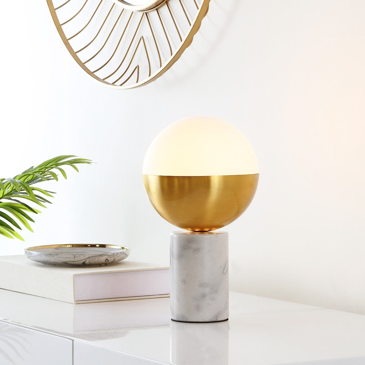 A grand modern statement for any glamorous interior, this Evolet Table Lamp abounds with depth and motion. Evolet?? modern art inspiration shines through its cylinder white marble pedestal, perfectly contrasted with the gold metal accenting Evolet?? while glass globe.