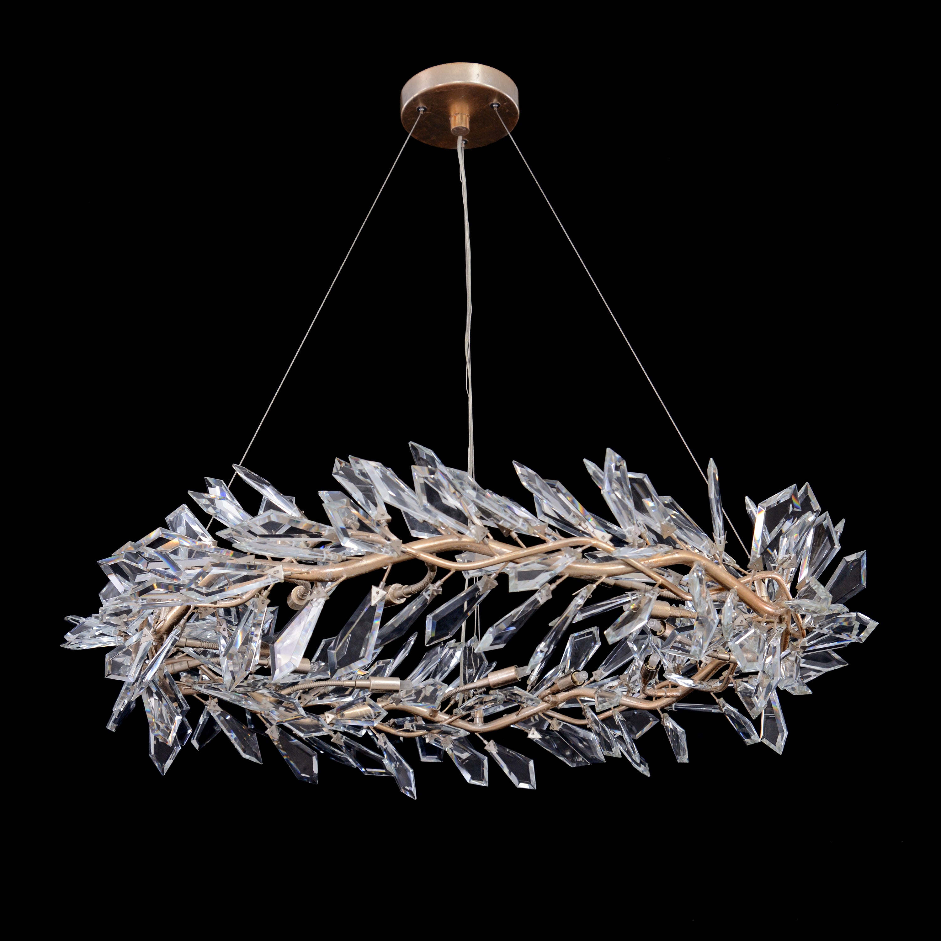 A winding branch of Antique Silver elegantly wraps itself into a floating wreath with the Kōtta Twelve-Light Chandelier. Lining the branch, a staggered arrangement of breathtaking hand-cut crystal leaves playfully refracts light, imbuing the piece with an undeniable presence. This piece is an interpretation of nature’s beauty through the language of modern design.