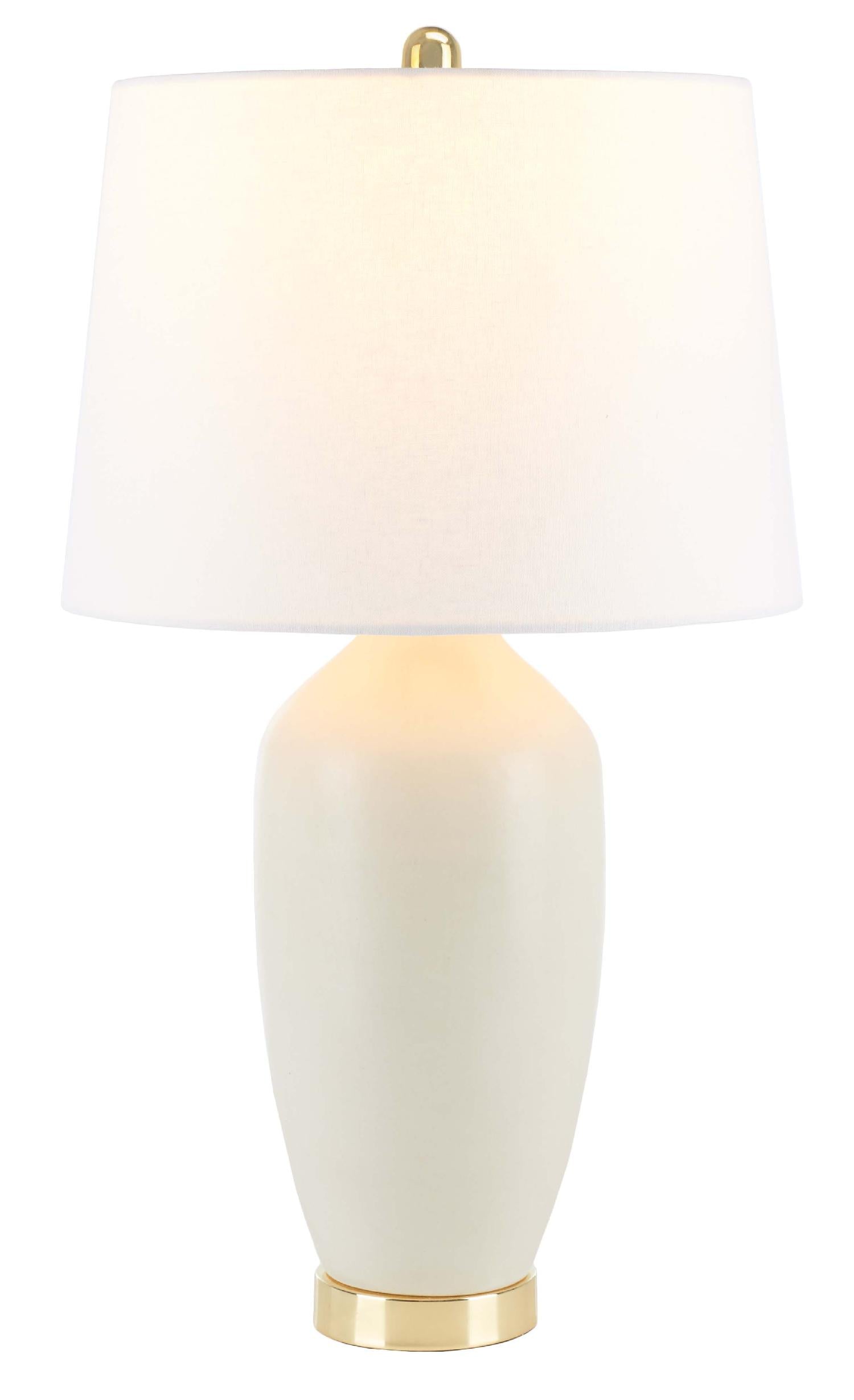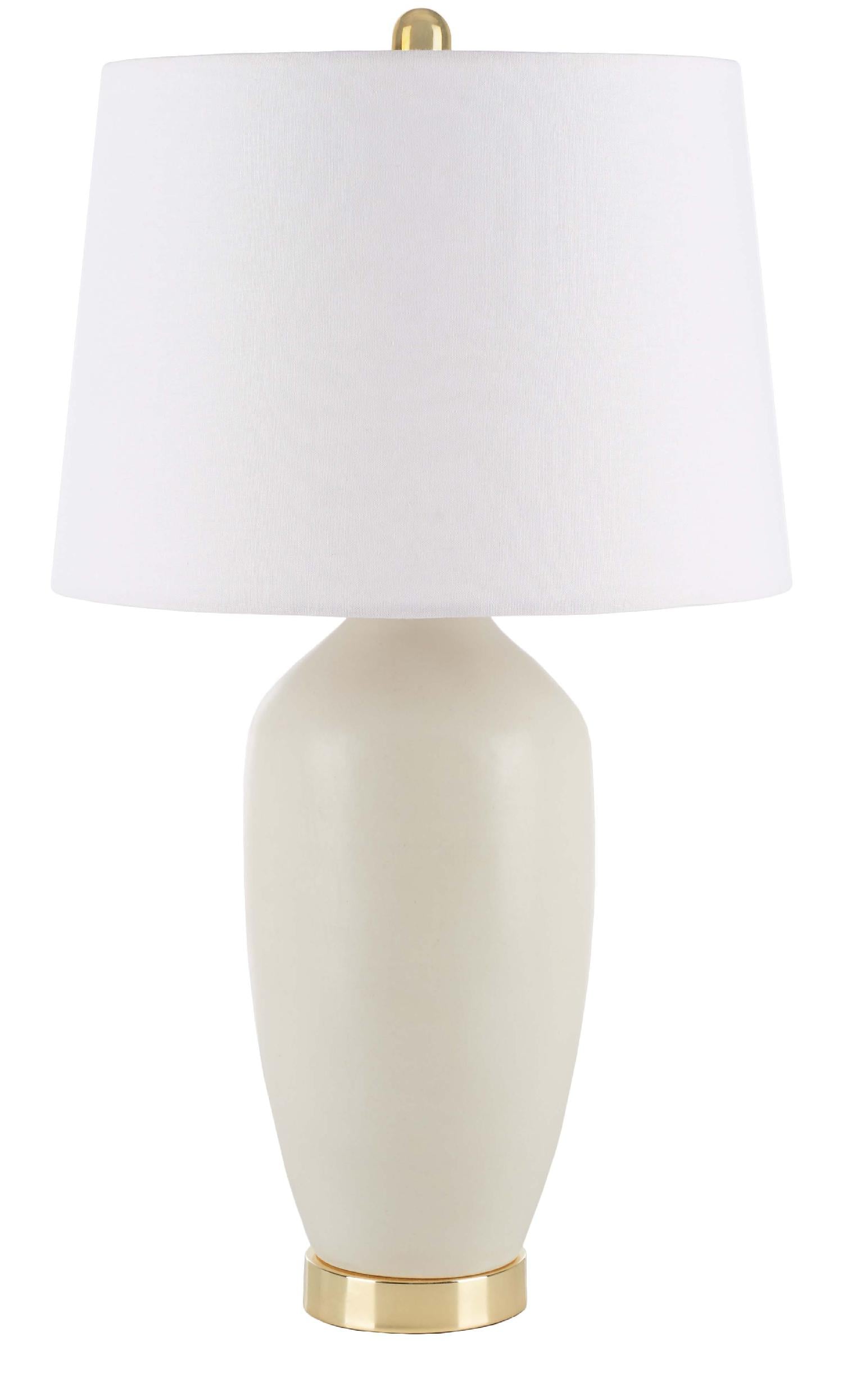 Upgrade your home with the refined aesthetics of our Laine table lamp. Its curvaceous ceramic body widens at the top to attain a graceful and sensuous presence. Finished off with a matte ivory glaze and polished brass, the table lamp uplifts your space with its sophisticated mix of textures. Our elegantly simple and graceful lamp adorns a white tapered drum shade to create a relaxed ambiance beside your sofa or bed.