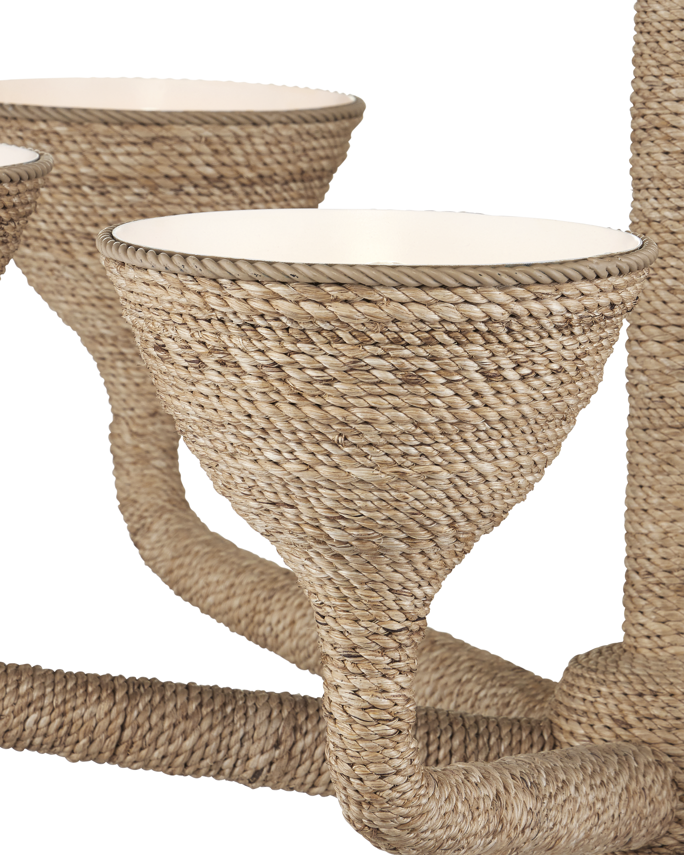 The abaca rope wrapped around the wrought iron form of the Marbella Chandelier is a warm element that will exude even greater depth when the ambient up-light is emitted. Though the shape is a time-honored one, the lines have been contemporized to make it as much at home in a modern room as it would be in a more traditional one. Adjustable from 35" to 103" with use of included chain/rod kit/cable. If your space calls for a longer drop, additional chain/rods/cable is available for purchase.