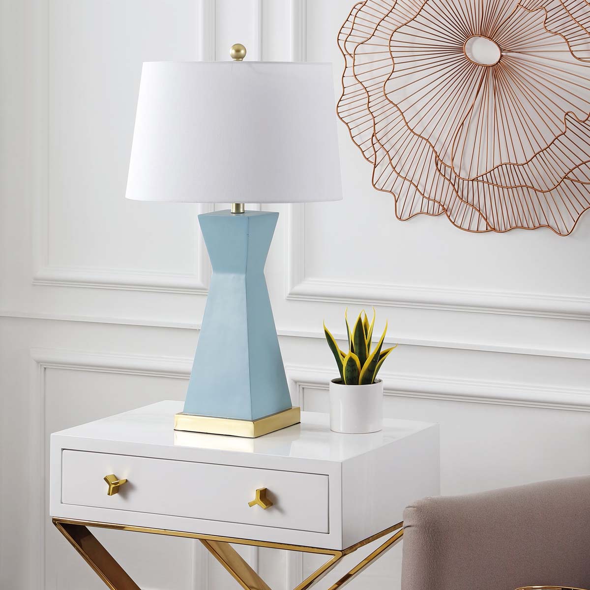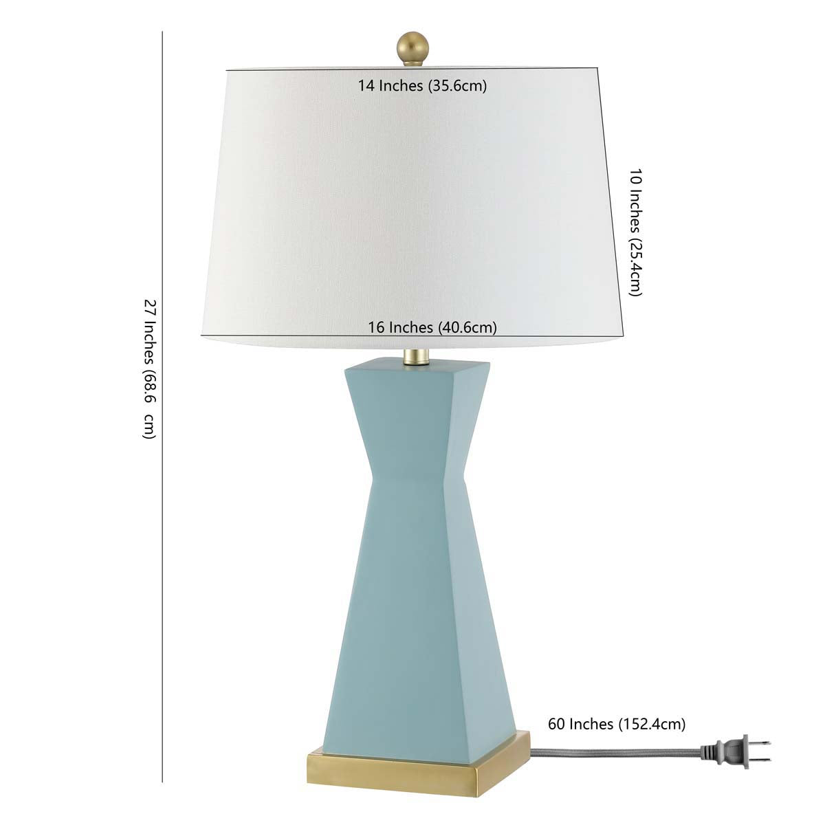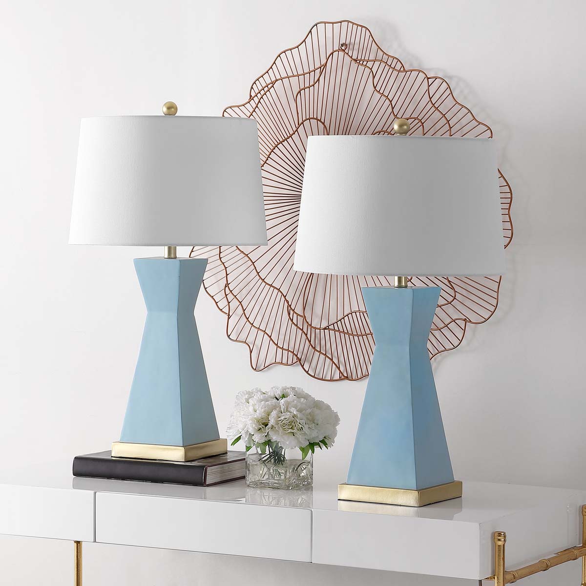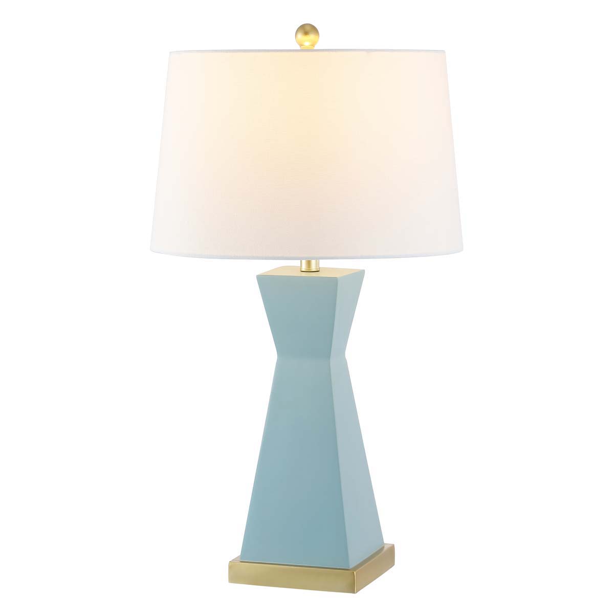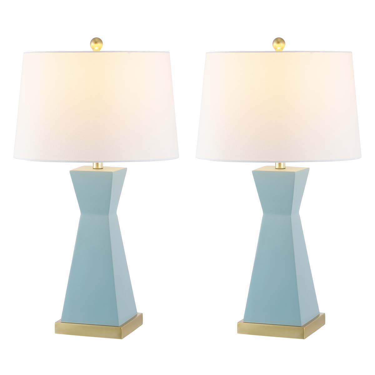 Statuesque, sleek, and stylish, this Onder Table Lamp overflows with sophistication. Onder’s geometric and asymmetric hourglass silhouette in robin’s egg blue resin is given a glamorous finishing touch with its shining gold base and matching hardware. Sold in sets of two.