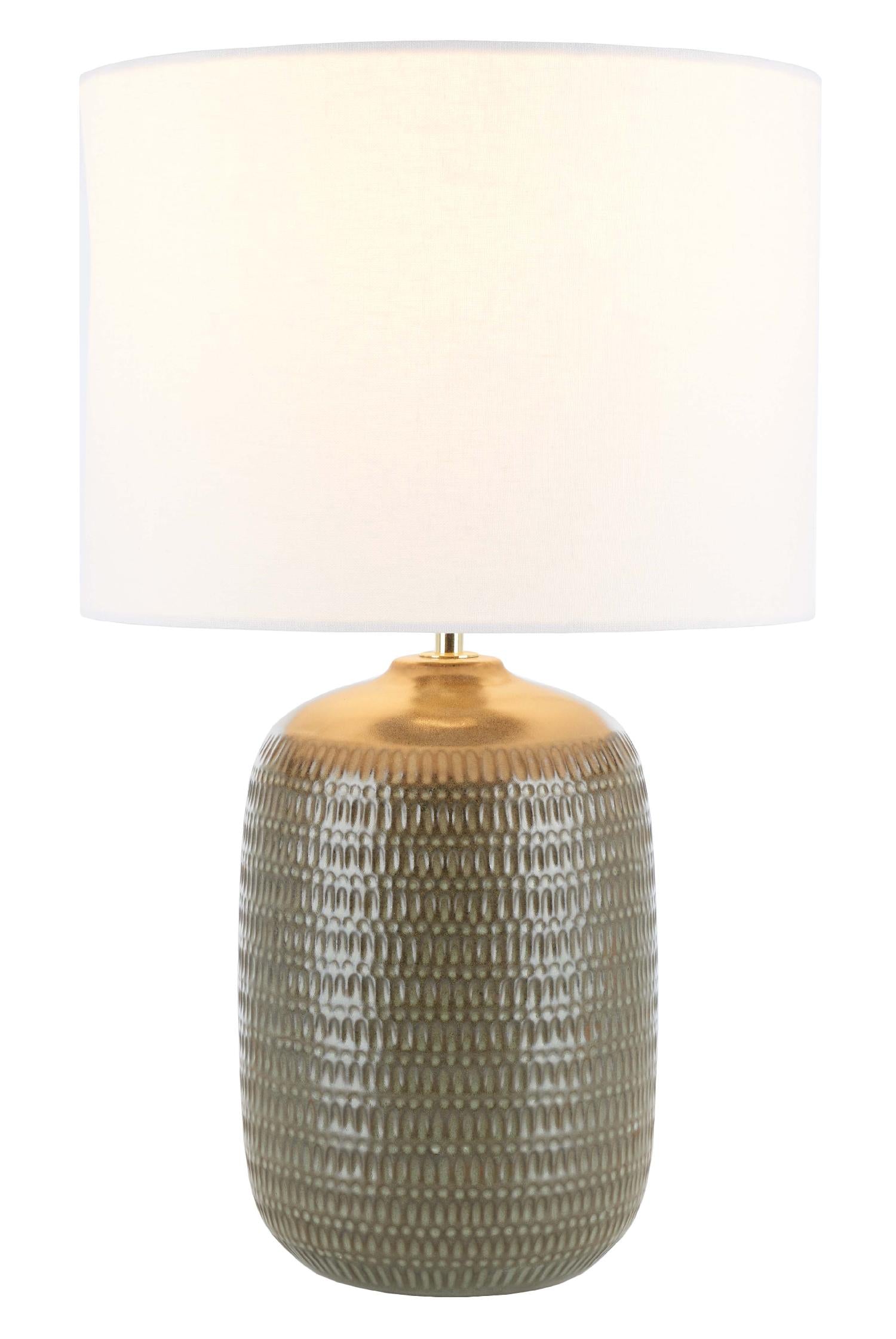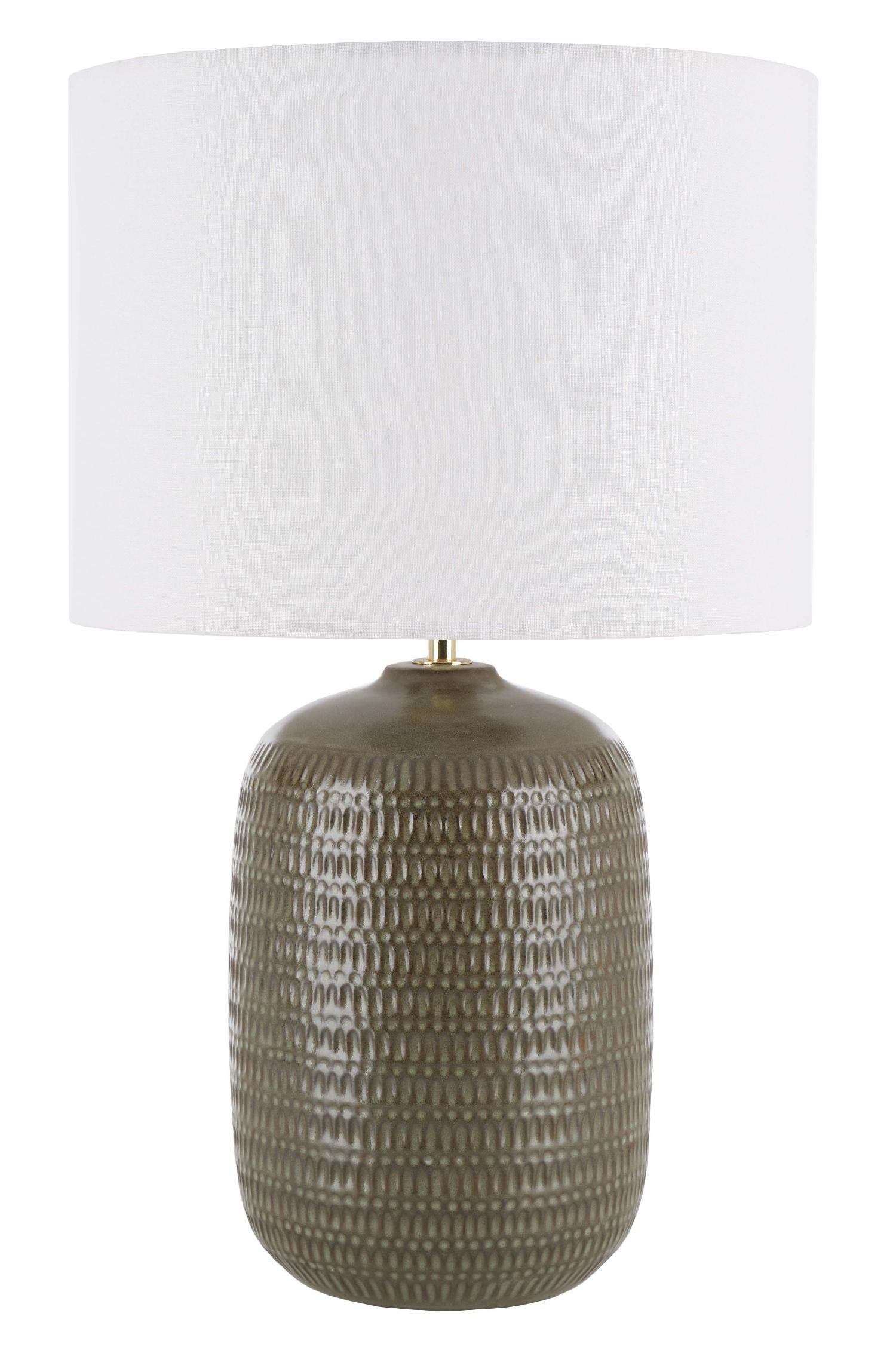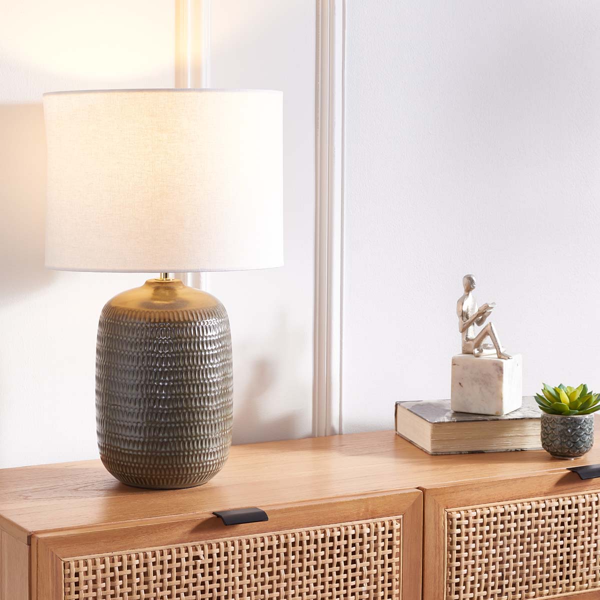 Bring a modern and artsy flair to your home with our Oryn ceramic table lamp. Its elegant ceramic body is defined by soft, curved edges. Enriched in taupe distressed glaze, the table lamp showcases an artistic texture and color variation, adding a dose of visual interest to your tabletop. It is finished off with a contrasting off-white drum shade that filters light for a pleasant and comforting glow.