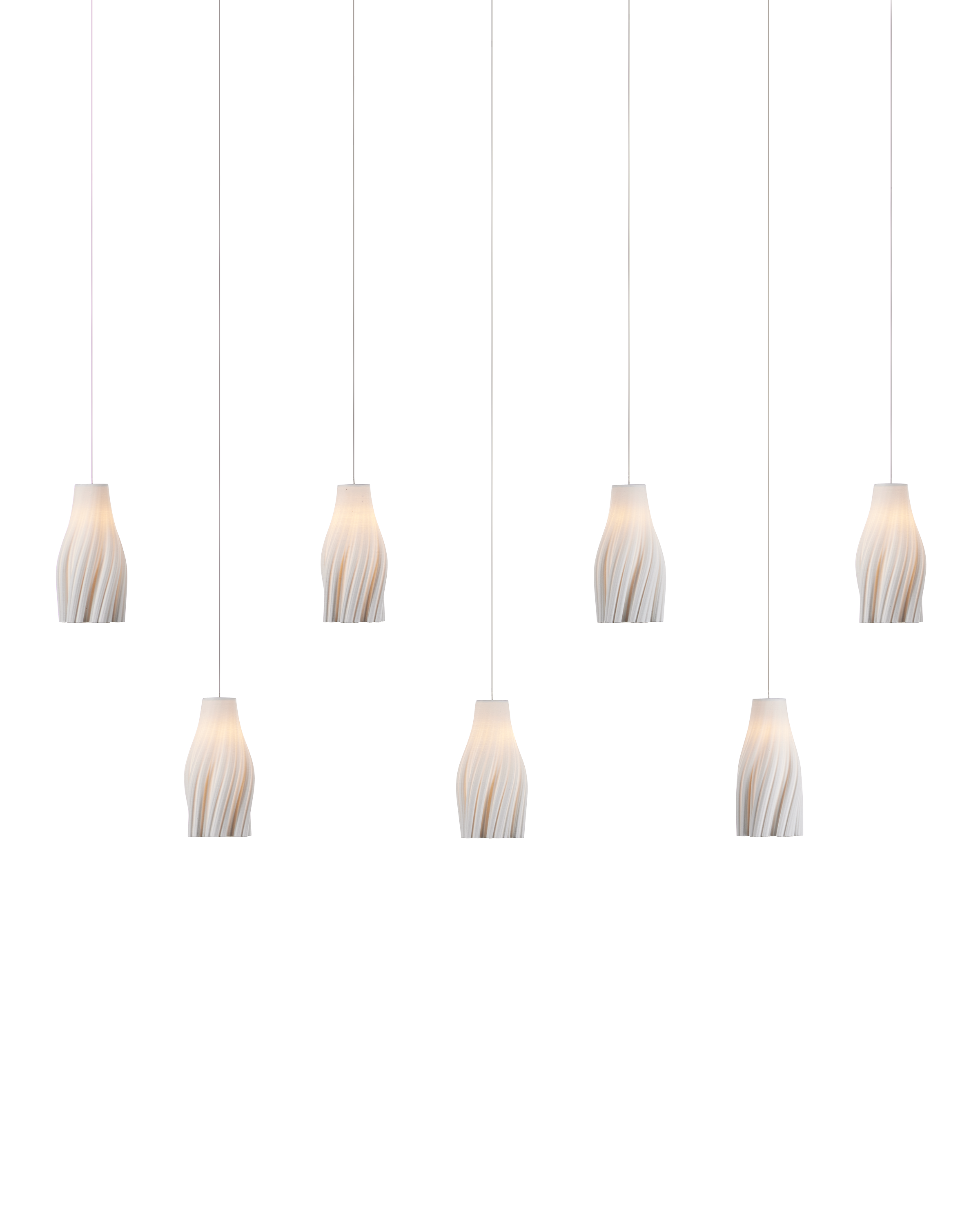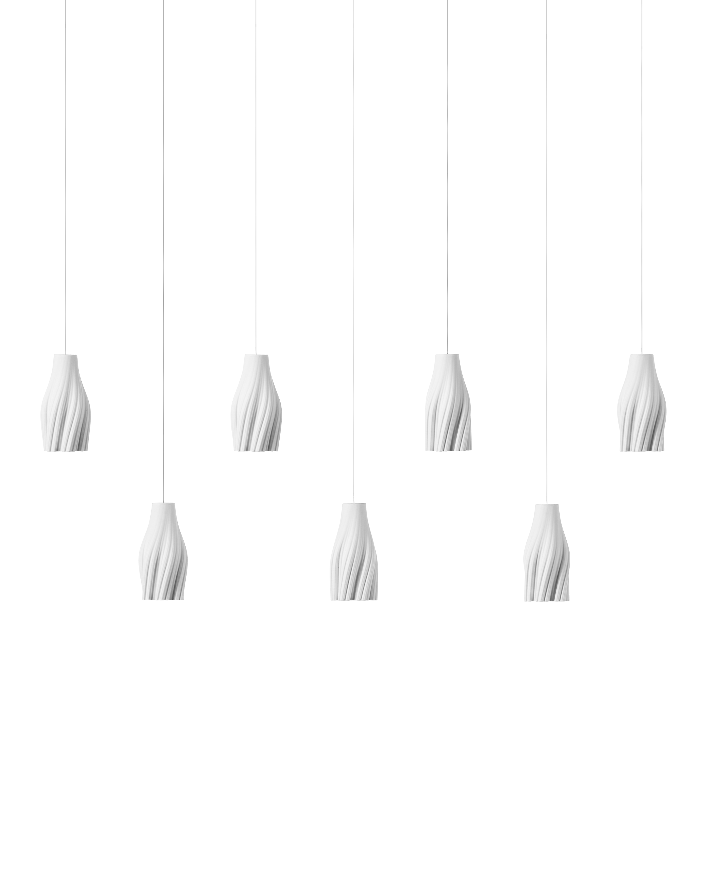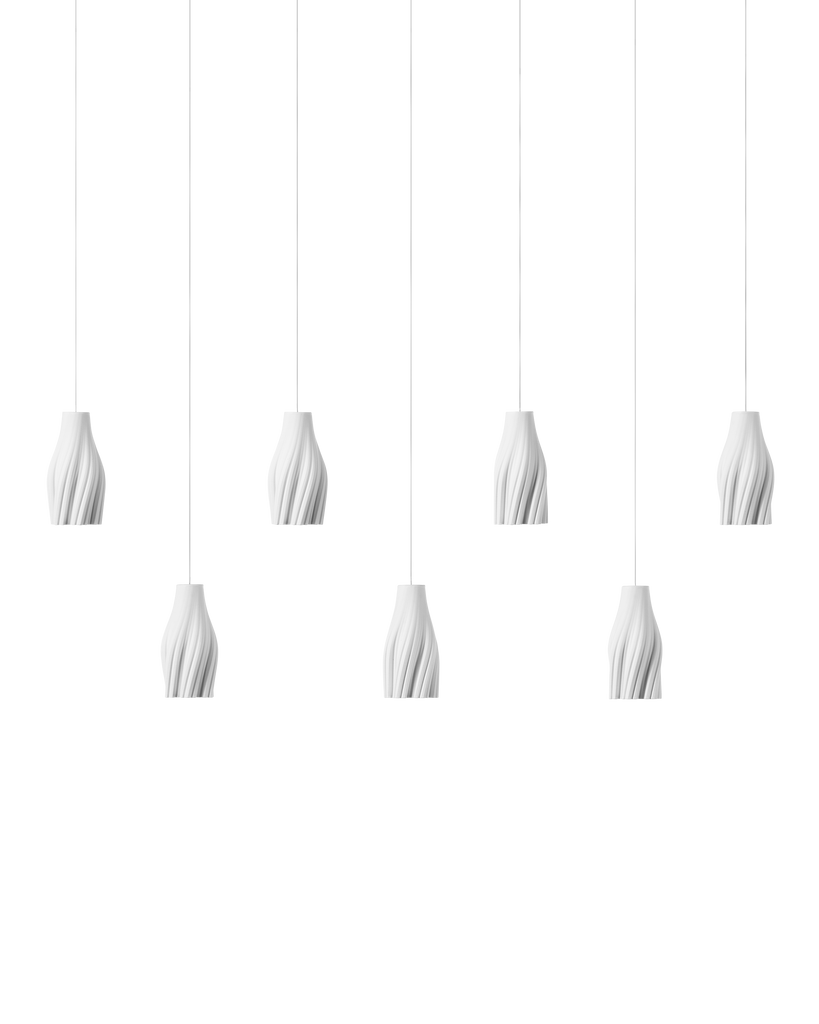 The Posh 7-Light Linear Multi-Drop Pendant has shades made of white ceramic crafted to resemble tassels. The sense of movement created by the material is an artisanal touch that brings the shades a lovely graceful quality. The thin silver cables from which they hangs leave the shades themselves to be the star of the design.