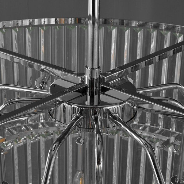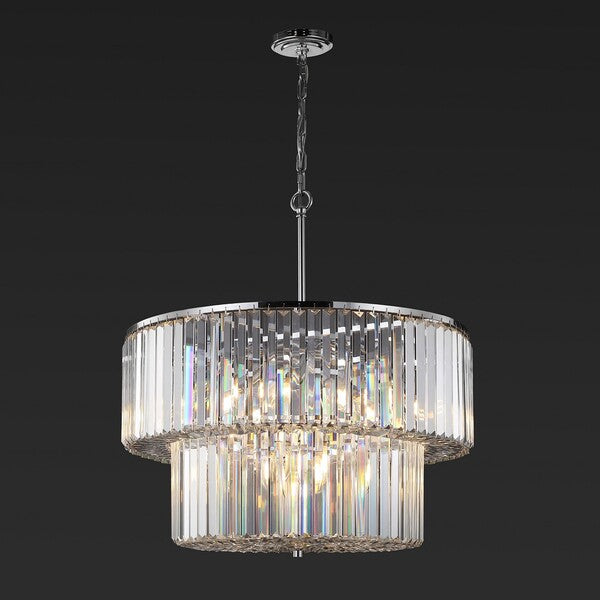 Update your home with the timeless luxury of our Viviann two-tier chandelier. A classic yet stunningly streamlined design defines the grace and elegance of our chandelier. Linearly cut crystals beautifully cascade from a circular metallic frame. The stunning combo of a shiny chrome frame and crystals ignite a dose of sophistication and elegance. Beautifully glimmering with light, our chandelier creates a radiant and welcoming effect to elevate a living space, bedroom, dining area, or kitchen.