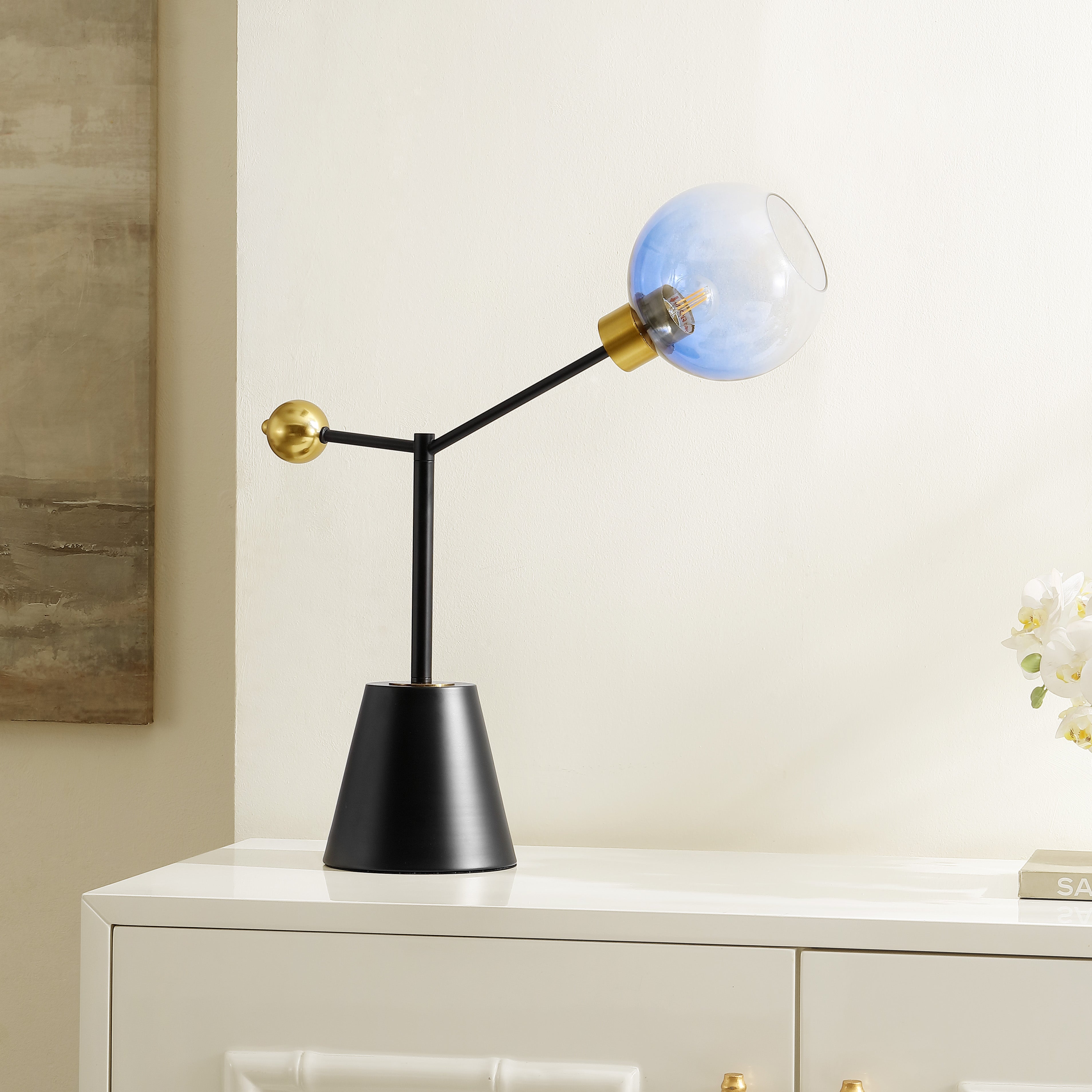 Illuminate your space with the charming Libra table lamp. Standing 24 inches tall, this striking piece combines black, blue, and brass to create a stunning visual appeal. Crafted with an elegant blend of iron and glass, it seamlessly fits into any decor style, offering a perfect balance of form and function. The multi-color design of the lamp adds a unique touch, making it not just a lighting fixture, but a statement piece in your home or office. Its sturdy metal construction ensures it is both robust and stylish. Whether placed on a desk, nightstand, or in the living room, the Libra table lamp enhances any setting with its sleek look and warm glow. Brighten your environment with this beautiful accessory that is sure to captivate and inspire.