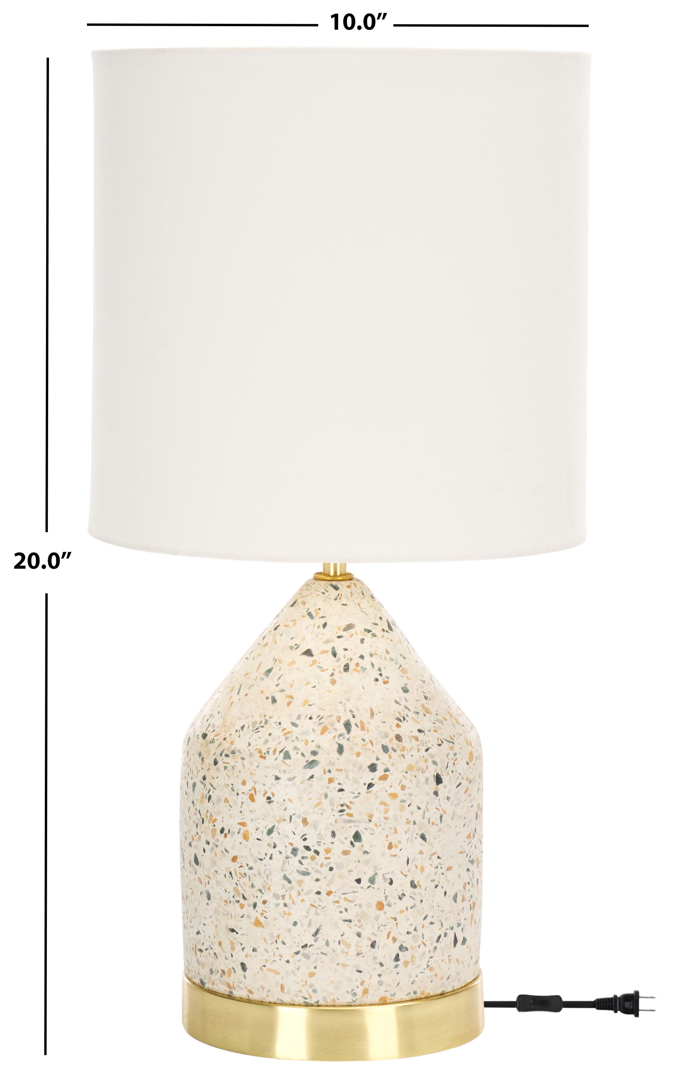 Illuminate your space with the elegant and stylish Nicolai Table Lamp. This exquisite piece features a robust terrazzo base with charming specks of color that bring an artful aesthetic to any room. Supported by a lustrous gold metal body, the lamp exudes a subtle touch of sophistication and warmth. Topped with a classic fabric shade in a crisp white finish, the Nicolai Table Lamp casts a gentle and inviting glow, making it an ideal addition to your nightstand, end table, or office desk. Its unique combination of materials and its visually pleasing color scheme offer a perfect balance of functionality and decorative appeal. Embrace a touch of luxury and grace in your lighting collection with this beautifully crafted table lamp.