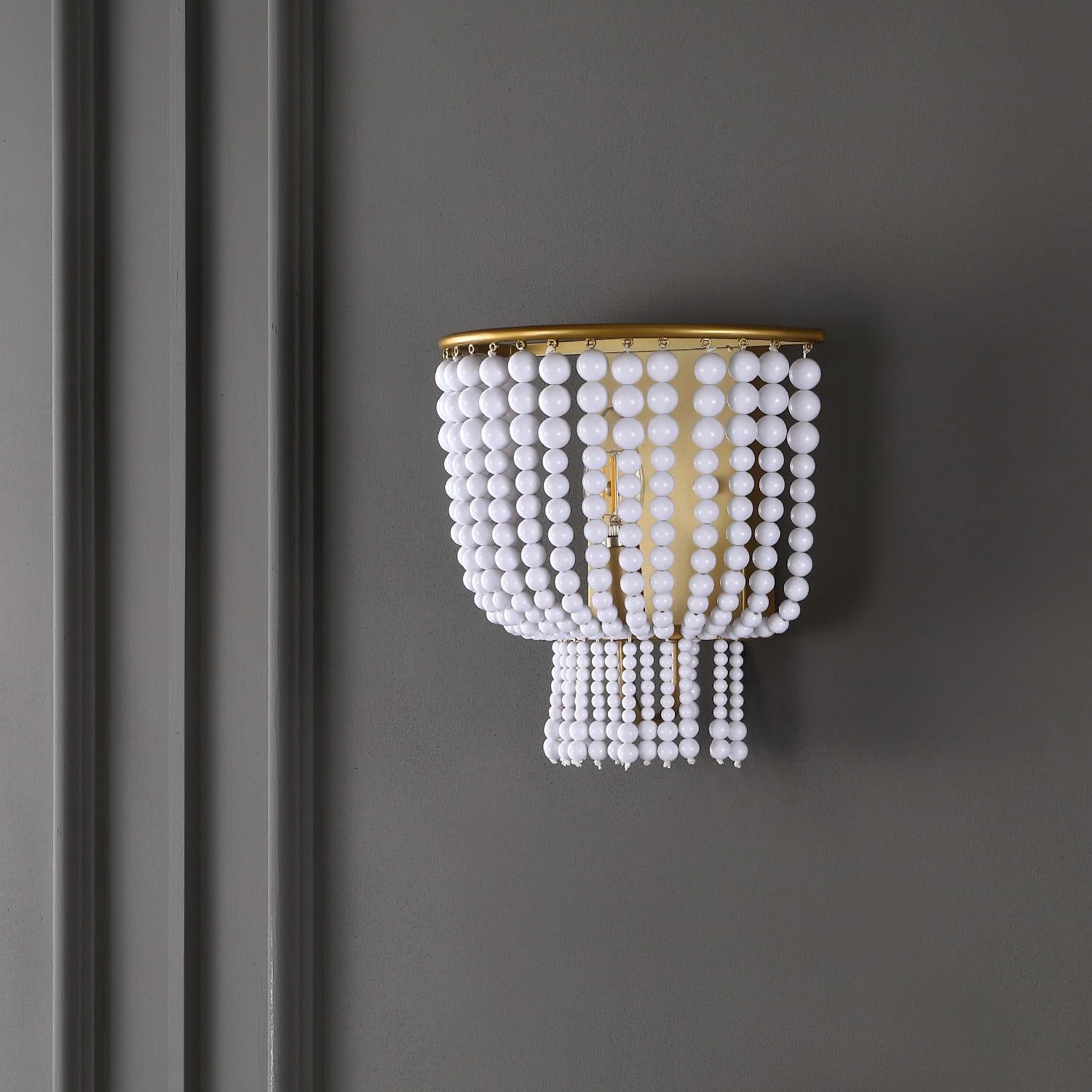 Boho goes glam in this captivating Celyn Wall Sconce. Celyn?? cascading white acrylic beads emanate a rich sense of depth and motion, while its gold frame and candle-style bulb lend a touch of classic elegance.