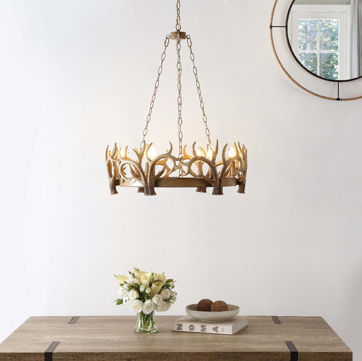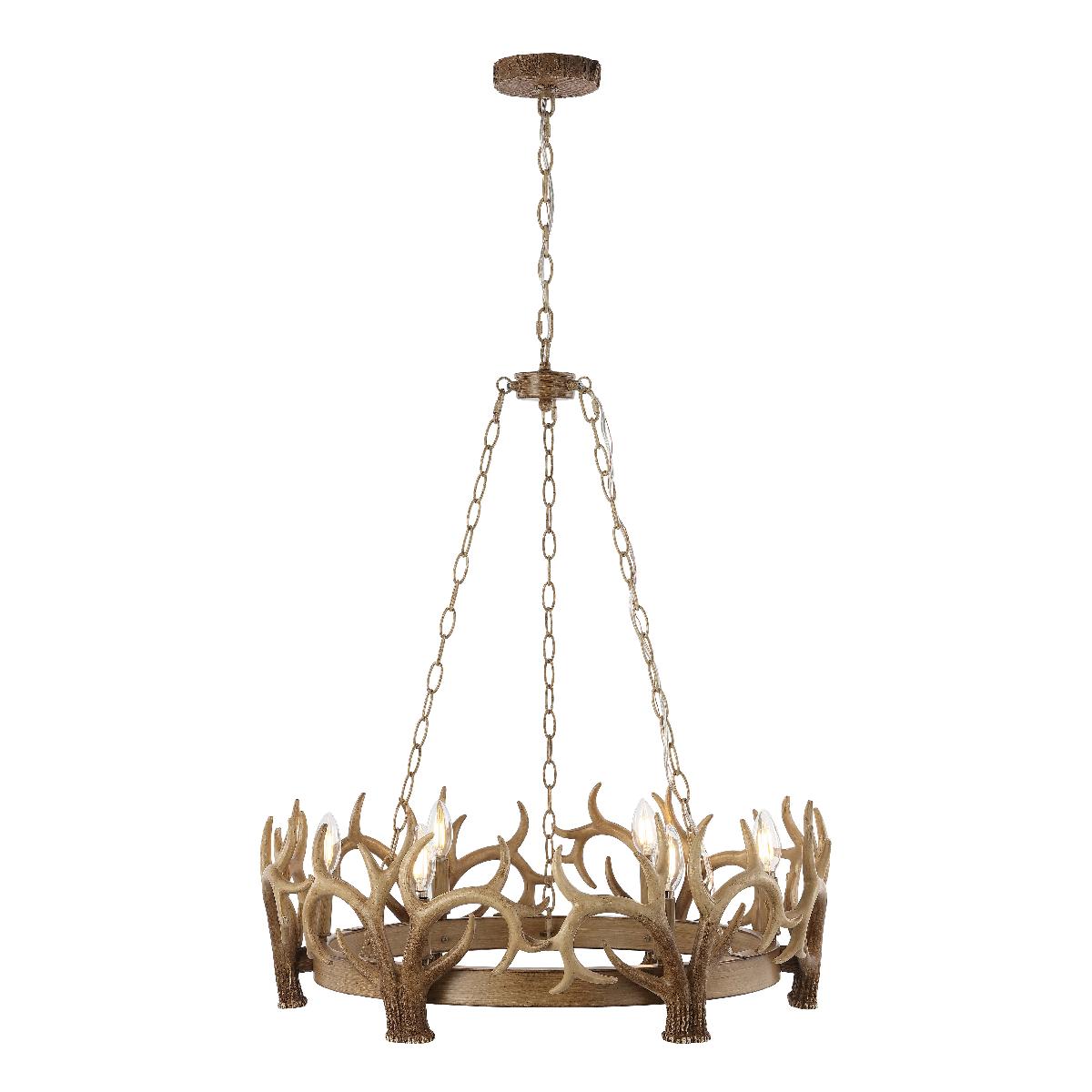 Brilliantly styled after the intricate, organic crowns of forest kings, this Duriel Chandelier exudes eclectic, earthy elegance. Duriel?? artistic interpretation of the classic antler chandelier in an antique brown finish makes it a designer favorite for rustic-chic interiors, while its six candle-style bulbs complete the look.
