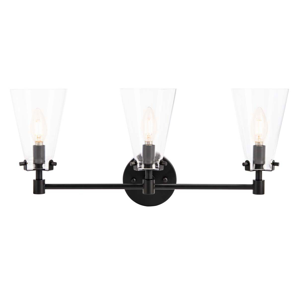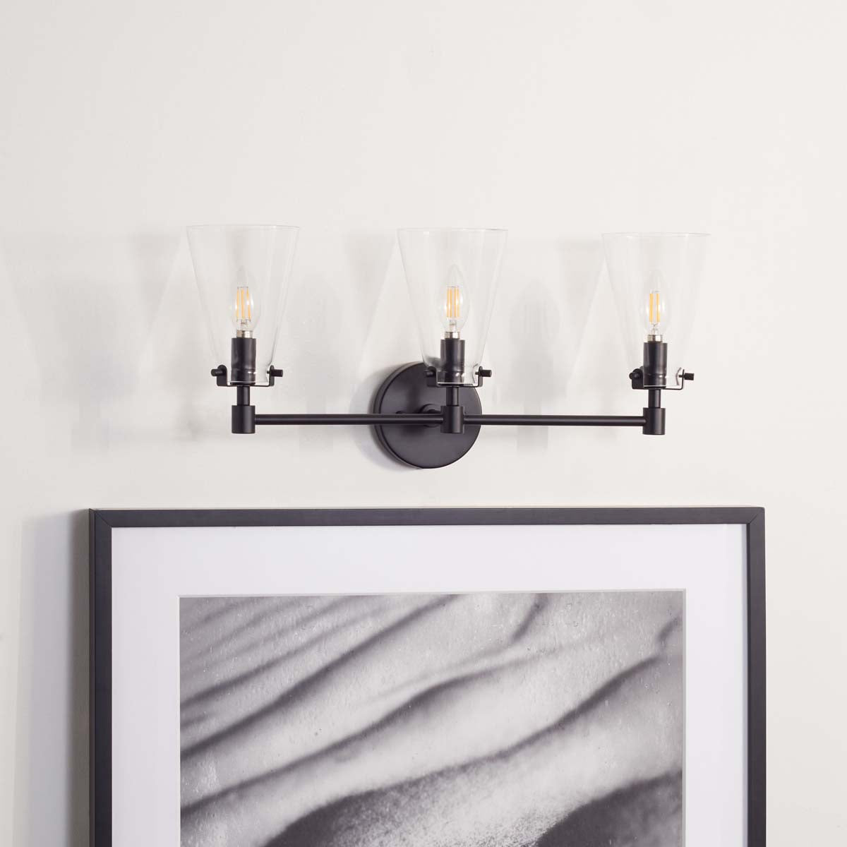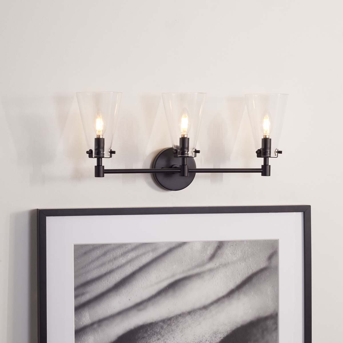 This Lonsen Vanity Sconce is the picture perfect way to illuminate your reflection with style and chic. Lonsen?? three conic glass shades cast a soft glow, held aloft by a sleek matte black body designed to effortlessly accent any interior.