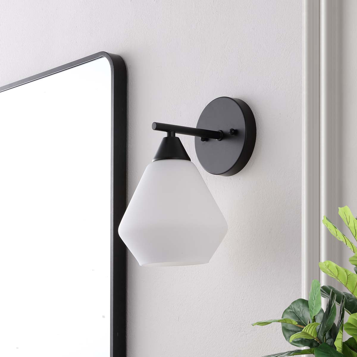 Give a refined contemporary update to your home with our Lyona wall sconces. A sleek metal arm extends to suspend our stunning glass shade. Defined by clean lines and crisp angles, the white glass shade attains a modern and sophisticated presence. It shows off the filament detailing to create a polished contrast with the black hardware. A contemporary stunner, our wall sconces are available in a set of two to radiate a warm and inviting glow to your hallway, living area, or bedroom.