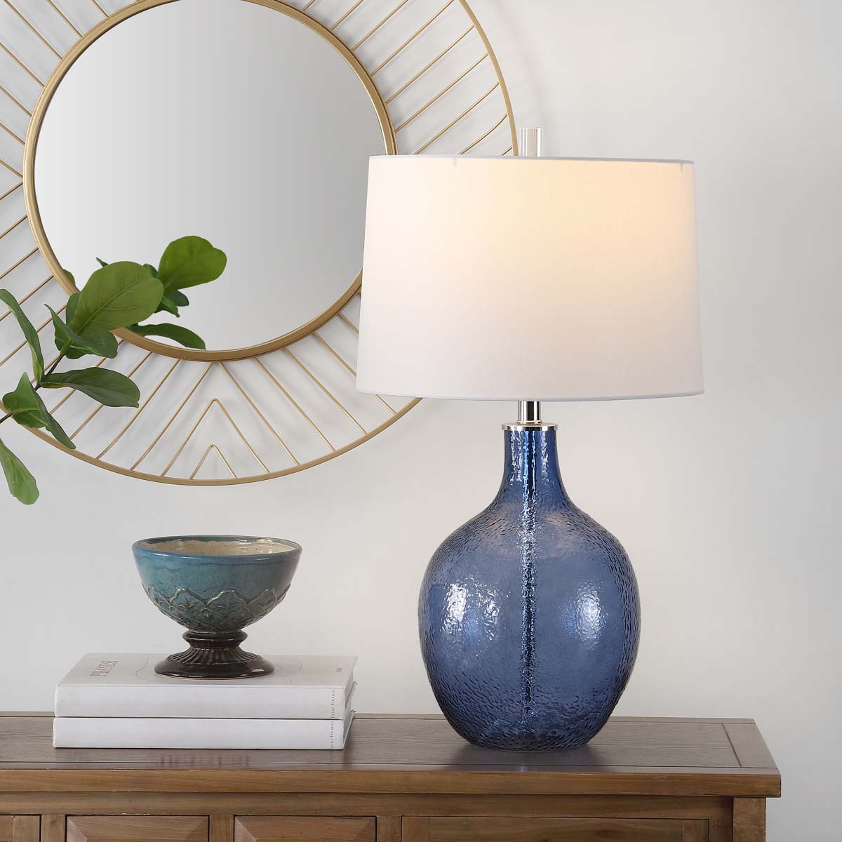 This Nadine Table Lamp pays homage to masters of glasswork with its classic urn silhouette but is absolutely today with its modern metal hardware. Ideal for any decor, Nadines glass body glimmers in the light diffused beneath its contemporary drum shade.