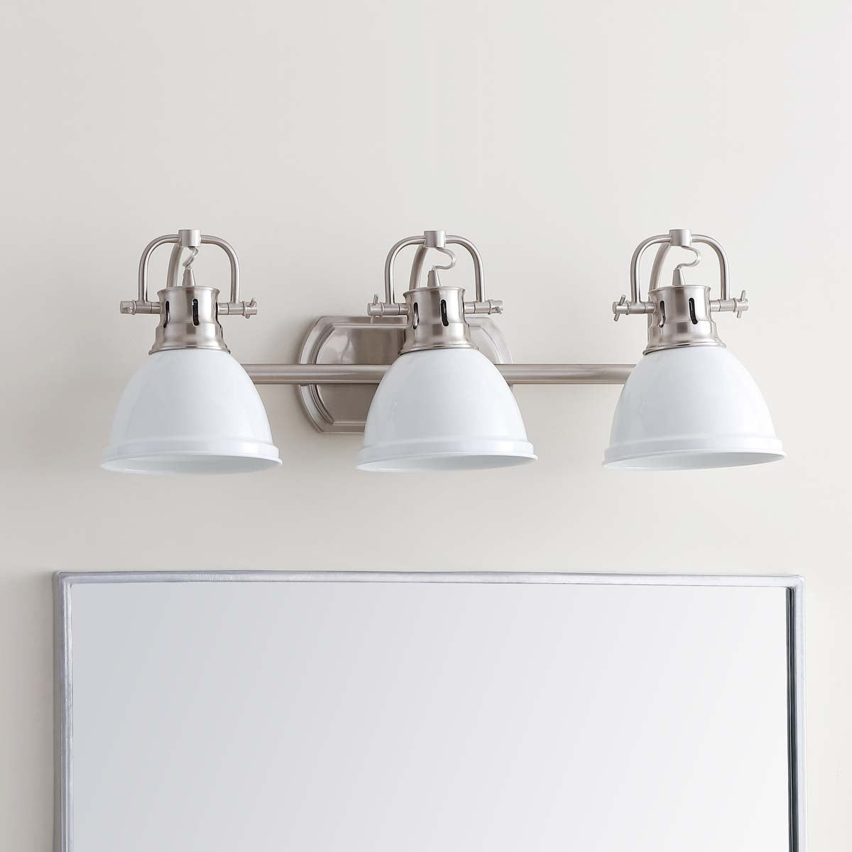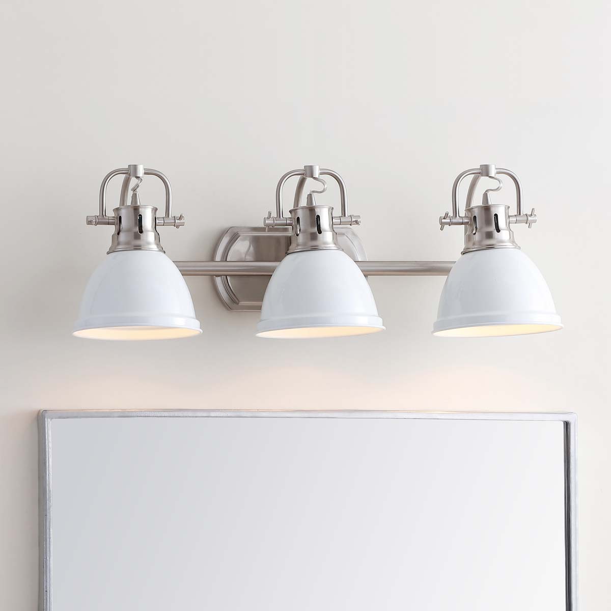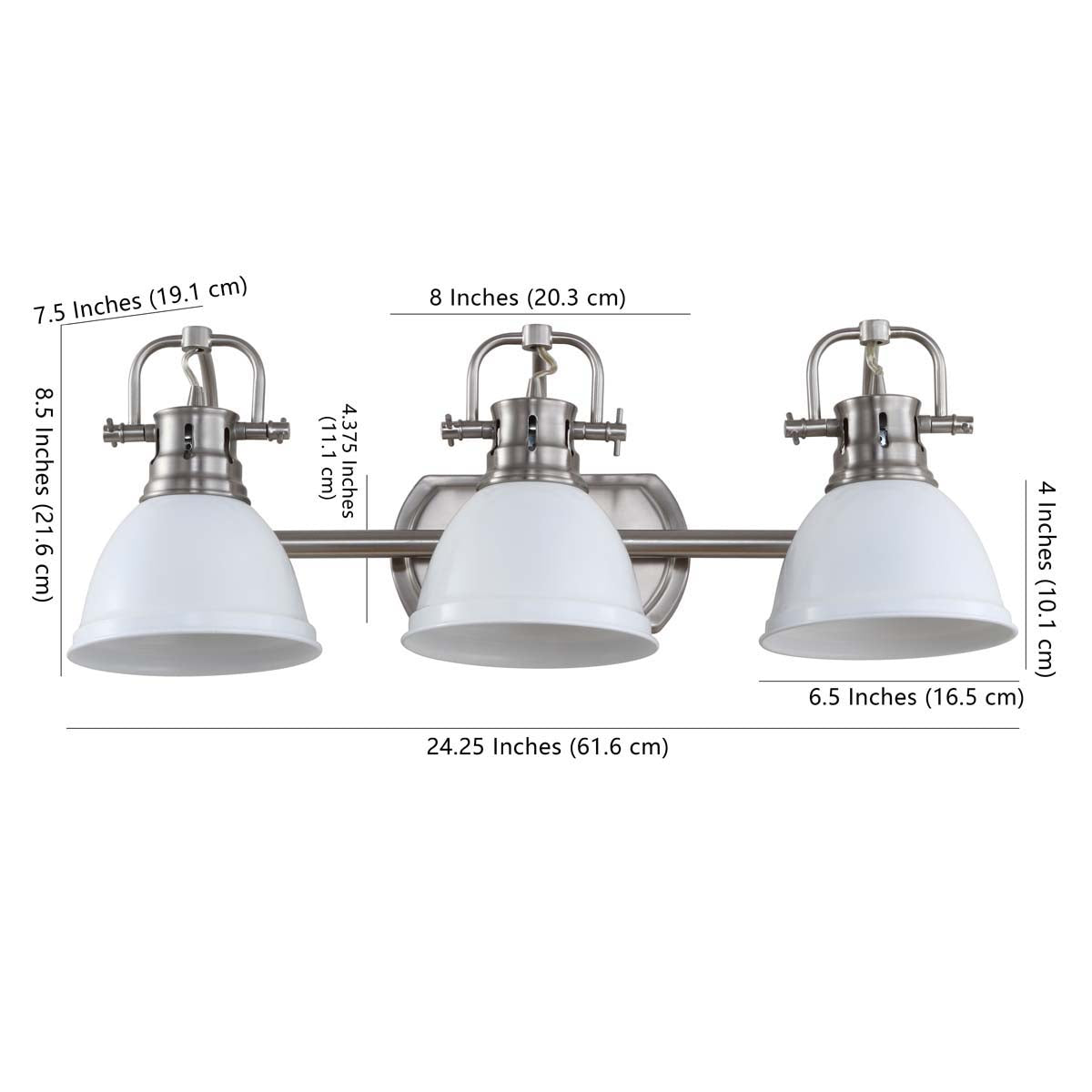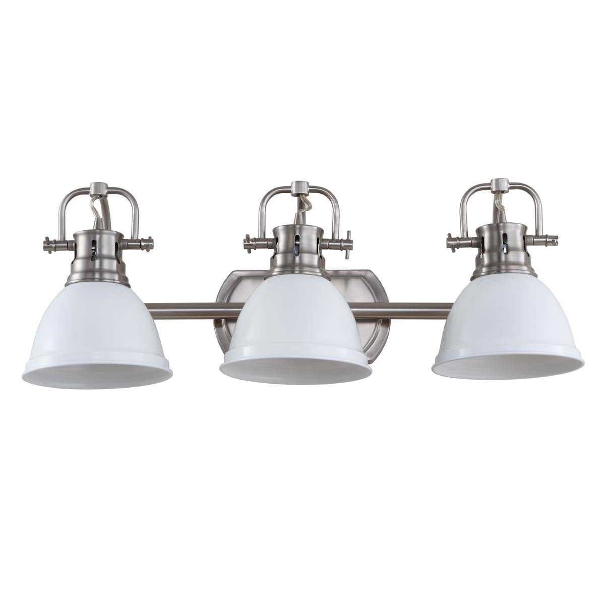 A perfect blend of form and function, this classic three light sconce is an investment for the bathroom. Constructed with the strength and durability of metal, its timeless nickel finish and white shade complement any d?cor.