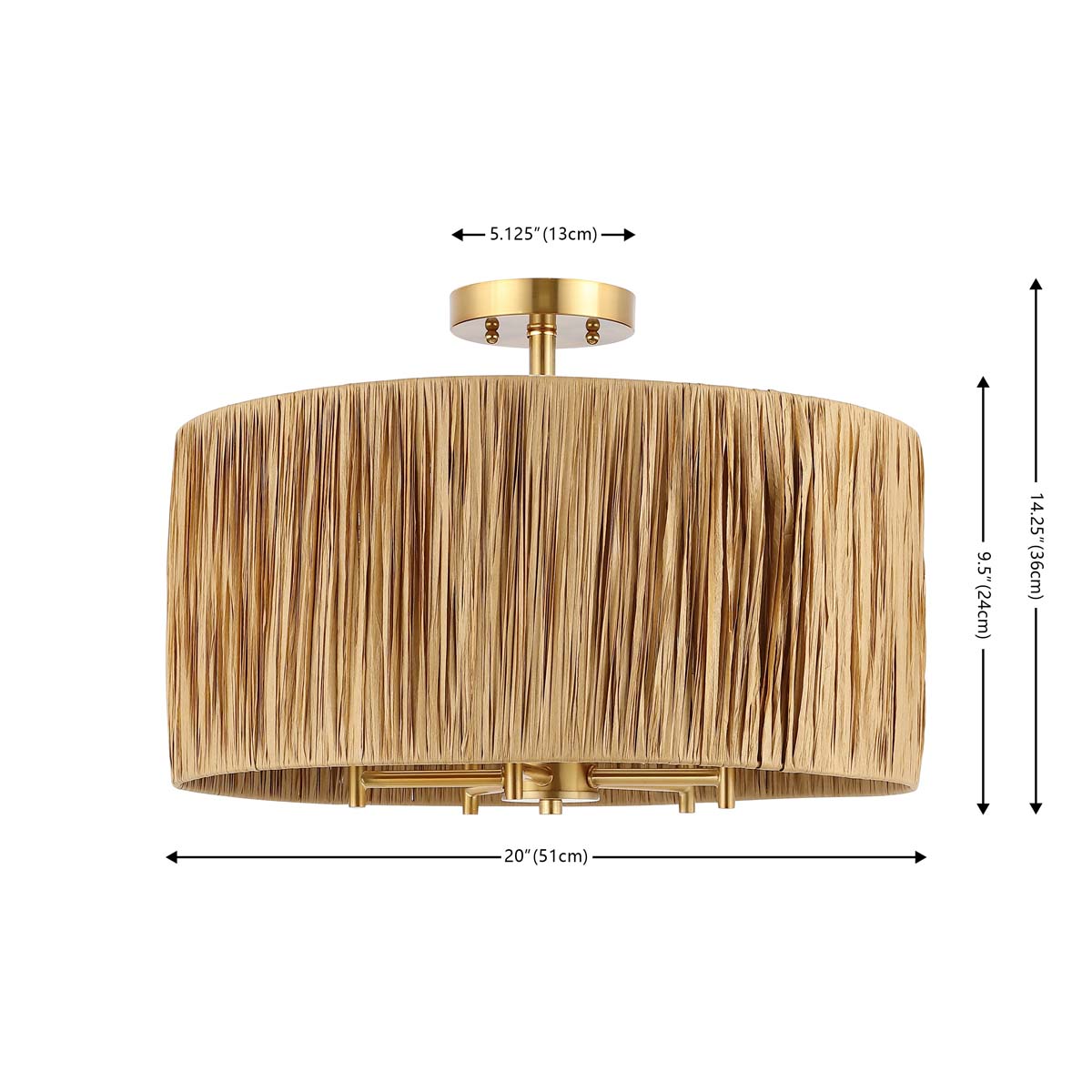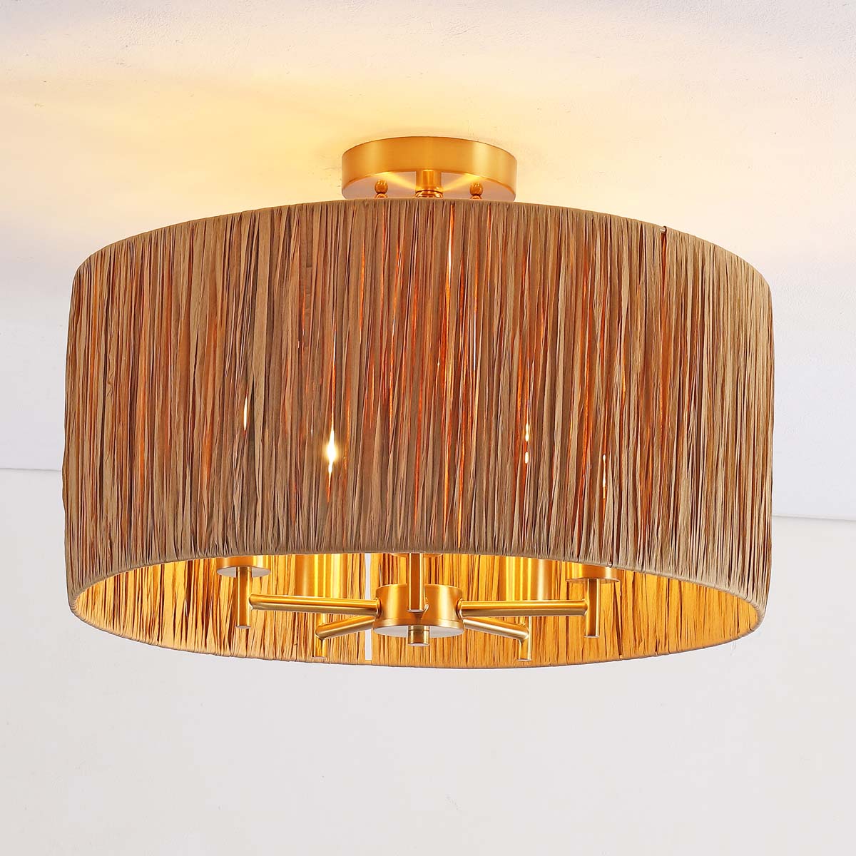 Give a modern and relaxed update to your home with our Selah flush mount. Its oversized drum shades attain a rich textural impact with wrapped lines. Its inviting natural finish is combined with gold hardware to inspire a refined yet breezy ceiling light. Making a chic and classy statement, our flush mount is fitted with 5 lights to offer brilliant overhead lighting for your kitchen, dining room, or bedroom.