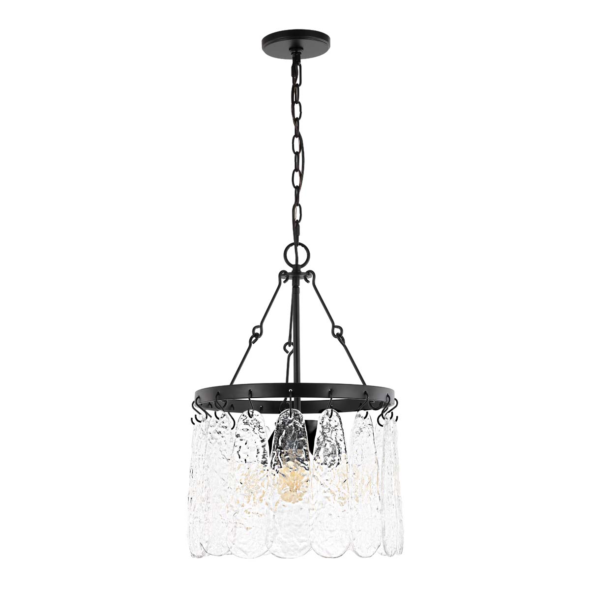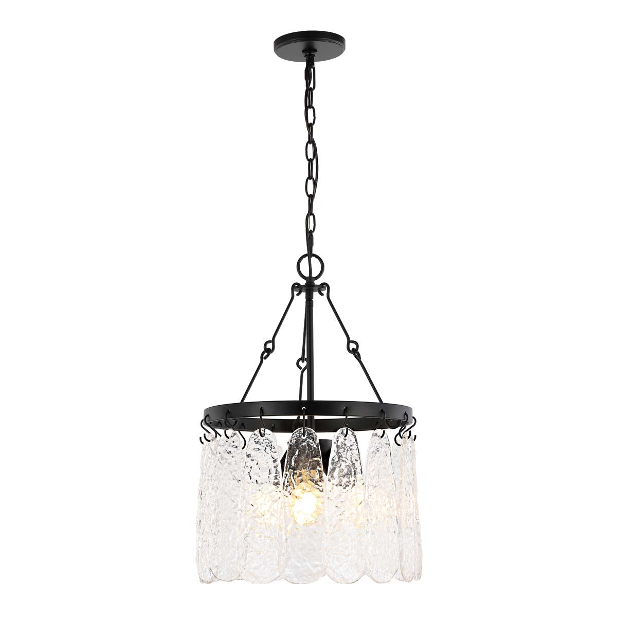 Update your home with the refined and charming aesthetics of our Thyrssa chandelier. A classic farmhouse chandelier is updated with a glamorous and streamlined design. Featuring a black iron ring with tear-shaped glass crystals, our chandelier shines and sparkles with eye-catching beauty. The ring is supported by three rustic chains to attain a well-loved transitional appeal. A perfect complement to both traditional and contemporary spaces, our chandelier includes three bulbs to cast a warm glow in an entryway, dining area, or bedroom.