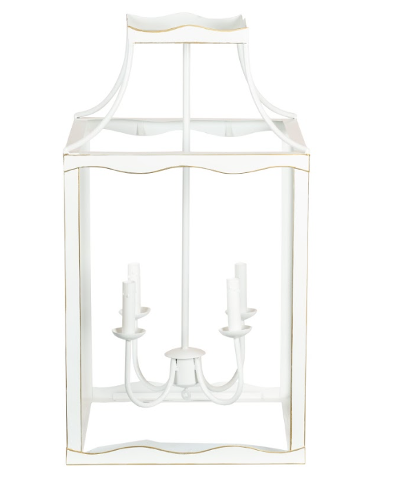 Introducing our elegant Soft White & Gold Lantern, a must-have for any luxurious space. Its hand-painted gold trim adds a touch of opulence. Includes chain and ceiling cap for easy hanging. Electrified for your convenience. The perfect addition to your home decor.
