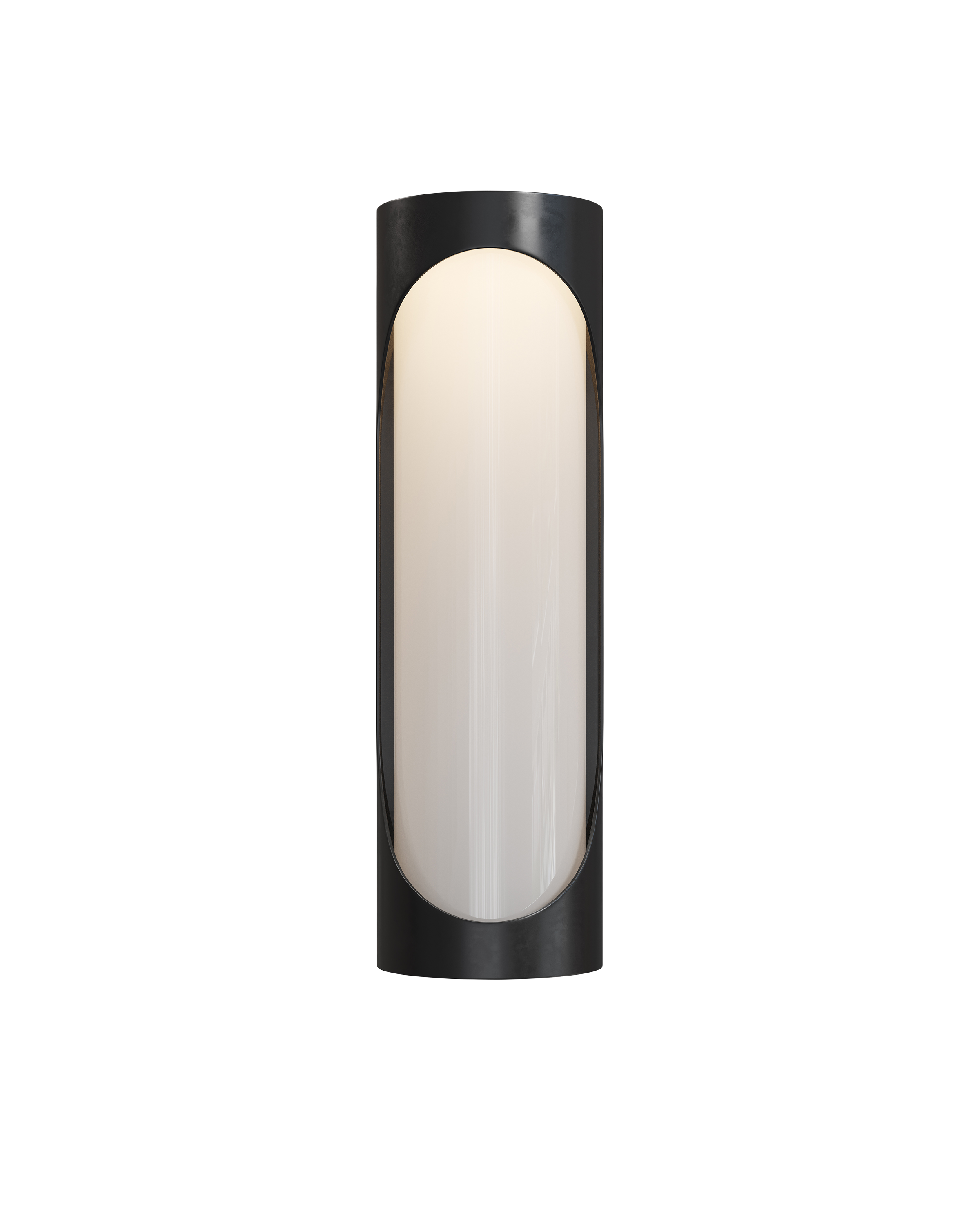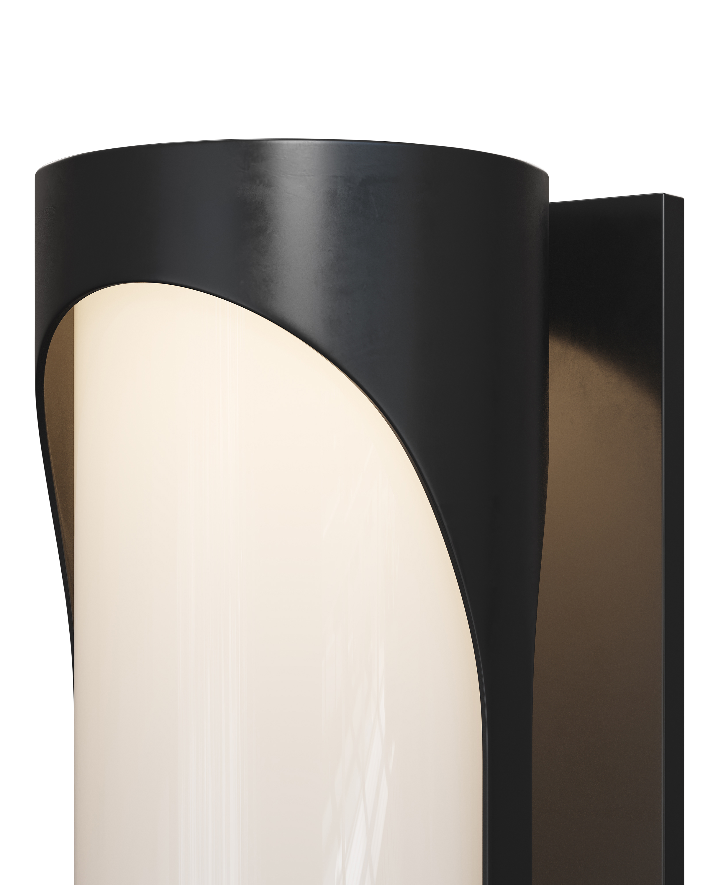 The Swale Small Outdoor Wall Sconce has a graphic silhouette with cut outs where illumination can escape. The front of the black sconce is covered with a milky white glass that illuminates uniformly when the integrated LEDs shine through it. The metal is powdercoated to make this outdoor sconce weather worthy.