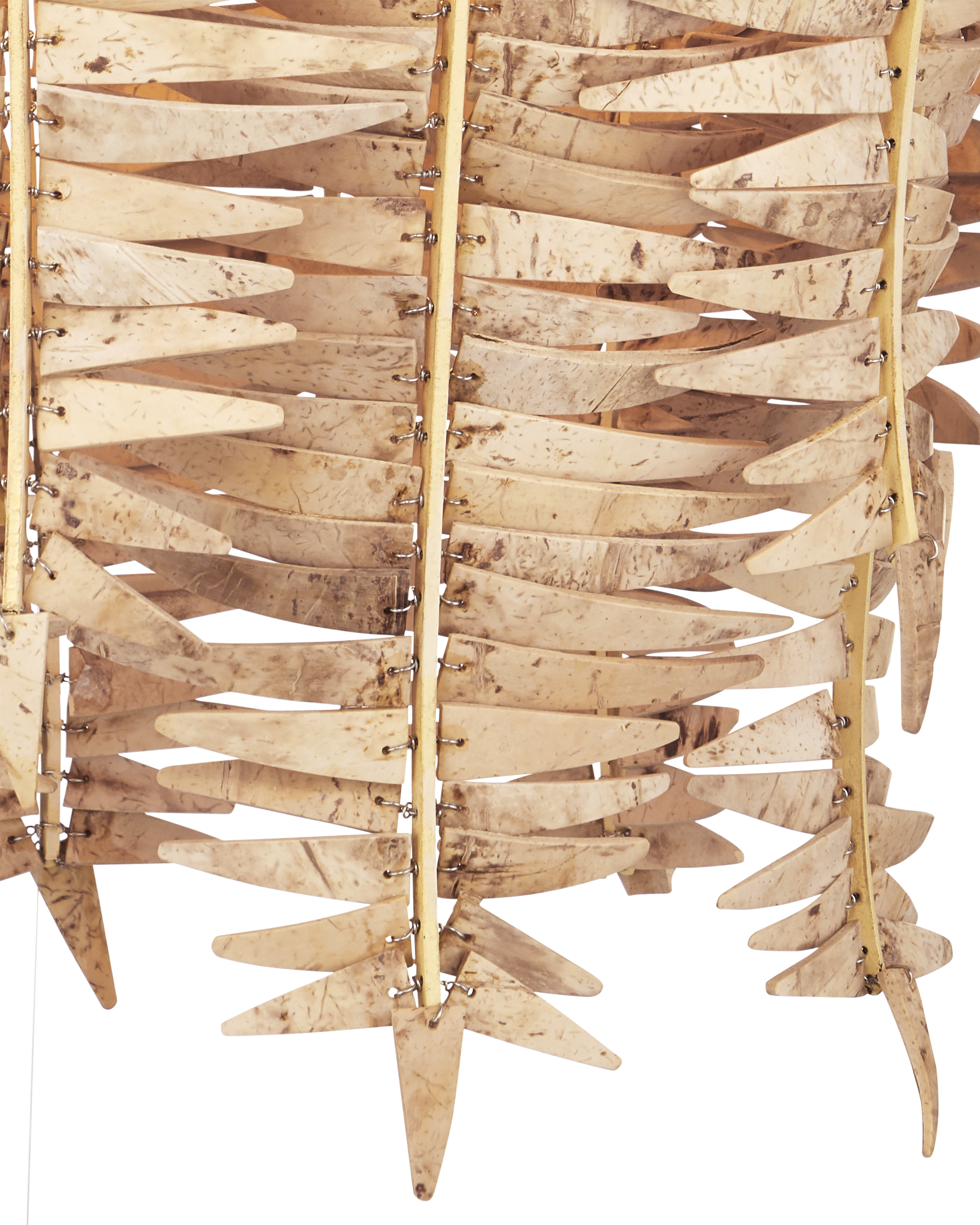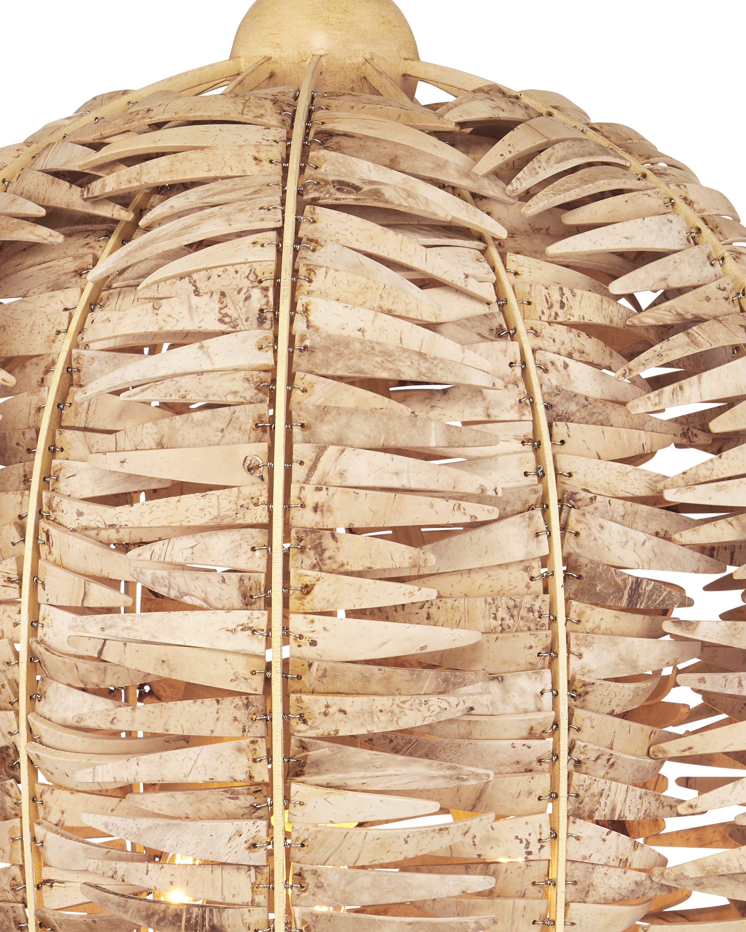 A tremendous amount of effort goes into creating the Tiptur Pendant, as the coconut shells are cut, bleached, drilled, and pinned to the frame by hand to form its bell shape. Tied to thin ribs of wrought iron in a coco cream finish, the color of the shells blends beautifully with the metal to create a veritable work of art. Adjustable from 34" to 102" with use of included chain/rod kit/cable. If your space calls for a longer drop, additional chain/rods/cable is available for purchase.