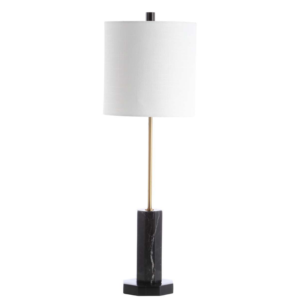 A modern marvel, this contemporary table lamp adds elegance to any living room. Its minimalist sculptural design is meticulously crafted with a luxurious pairing of black marble and brass. Designers love its complementary 100% cotton off white shade.