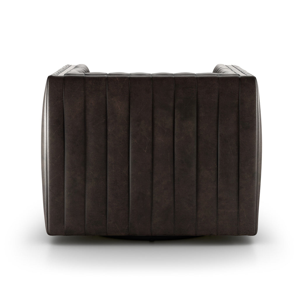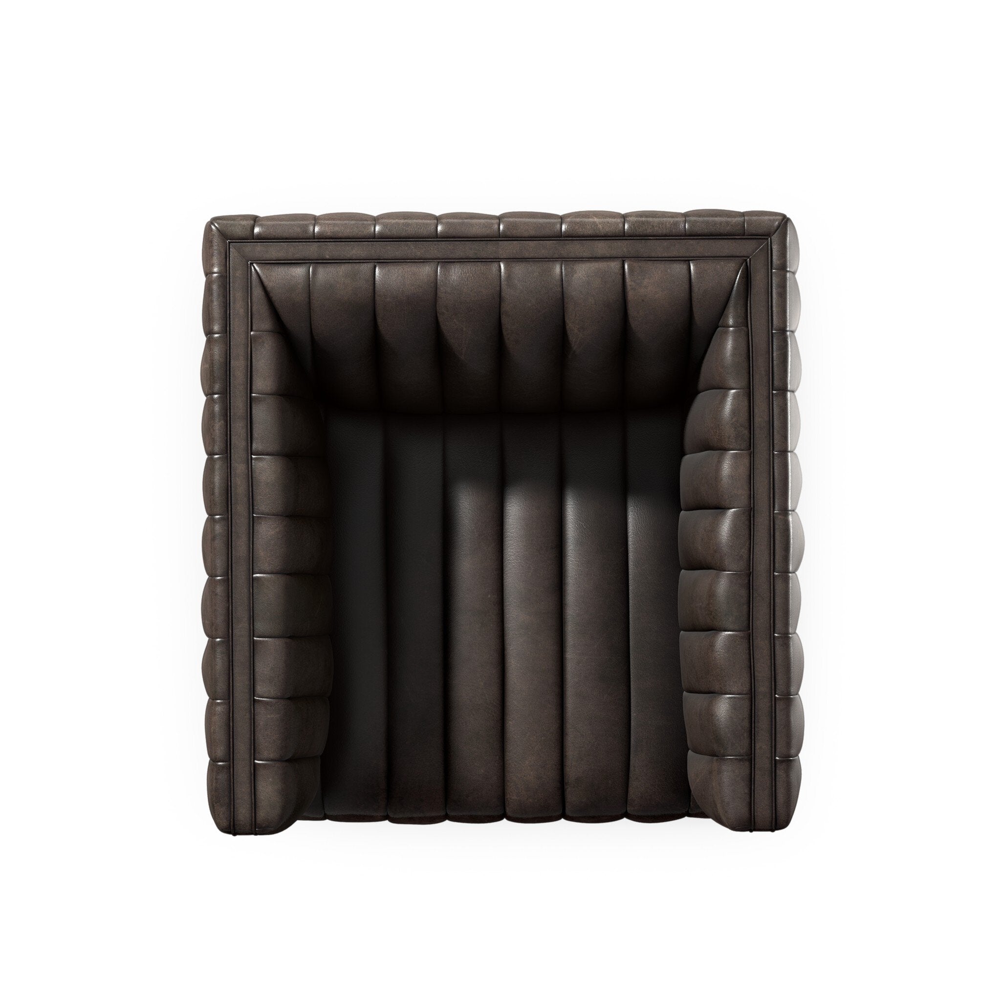 A modern take on the classic library chair, luxurious, Italian-inspired seating features dramatic channeling for trend-forward texture and a sumptuous sit. Upholstered in top-grain leather. A 360-degree swivel delivers fresh appeal from every angle.