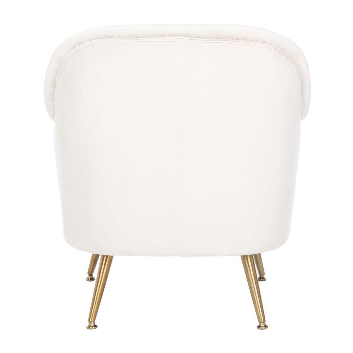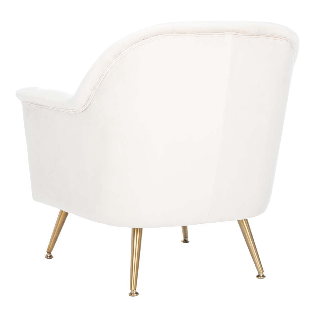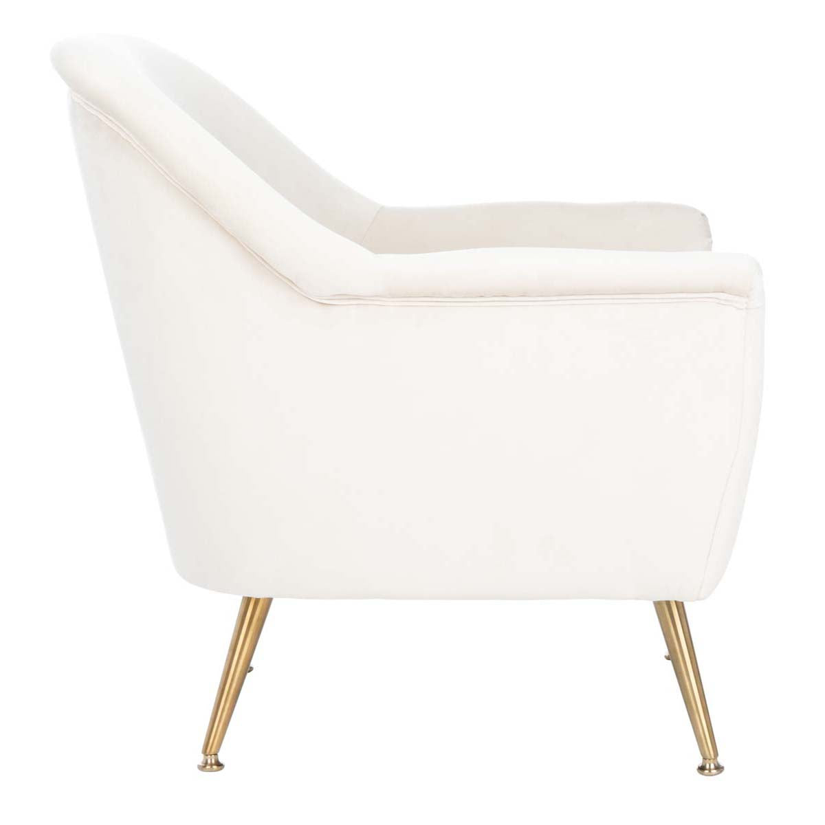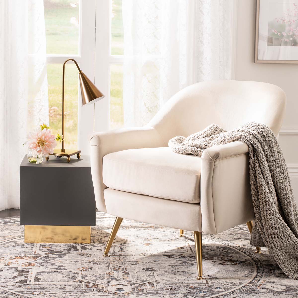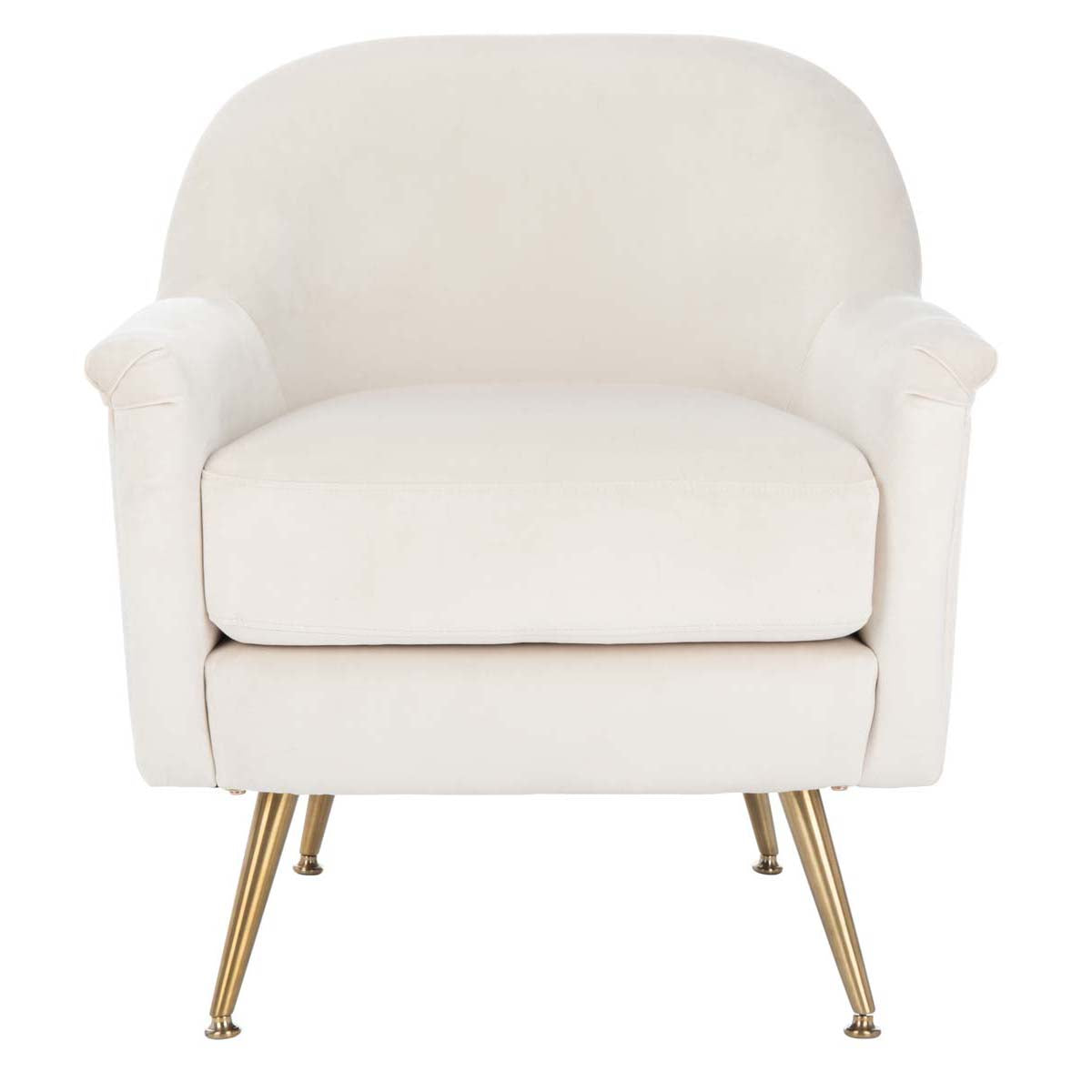 Update any living room with the fresh retro flair of this Brienne Mid Century Arm Chair. Brienne's plush ivory velvet is paired with vintage style brass legs to create a luxuriously glam retreat for relaxing with an after work cocktail.